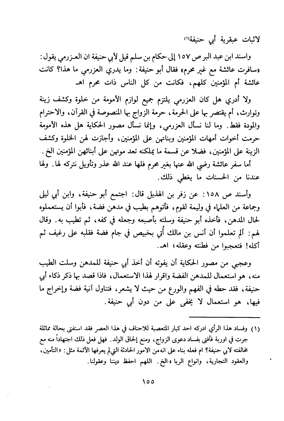 وأسند ابن عبد البر ص 157 إلى حكام بن سلم قيل لأبي حنيفة إن العزرمي يقول: "سافرت عائشة مع غير محرم " فقال أبو حنيفة: وما يدري العزرمي ما هذا؟ كانت عائشة أم المؤمنن كلهم، فكانت من كل الناس ذات محرم اهـ