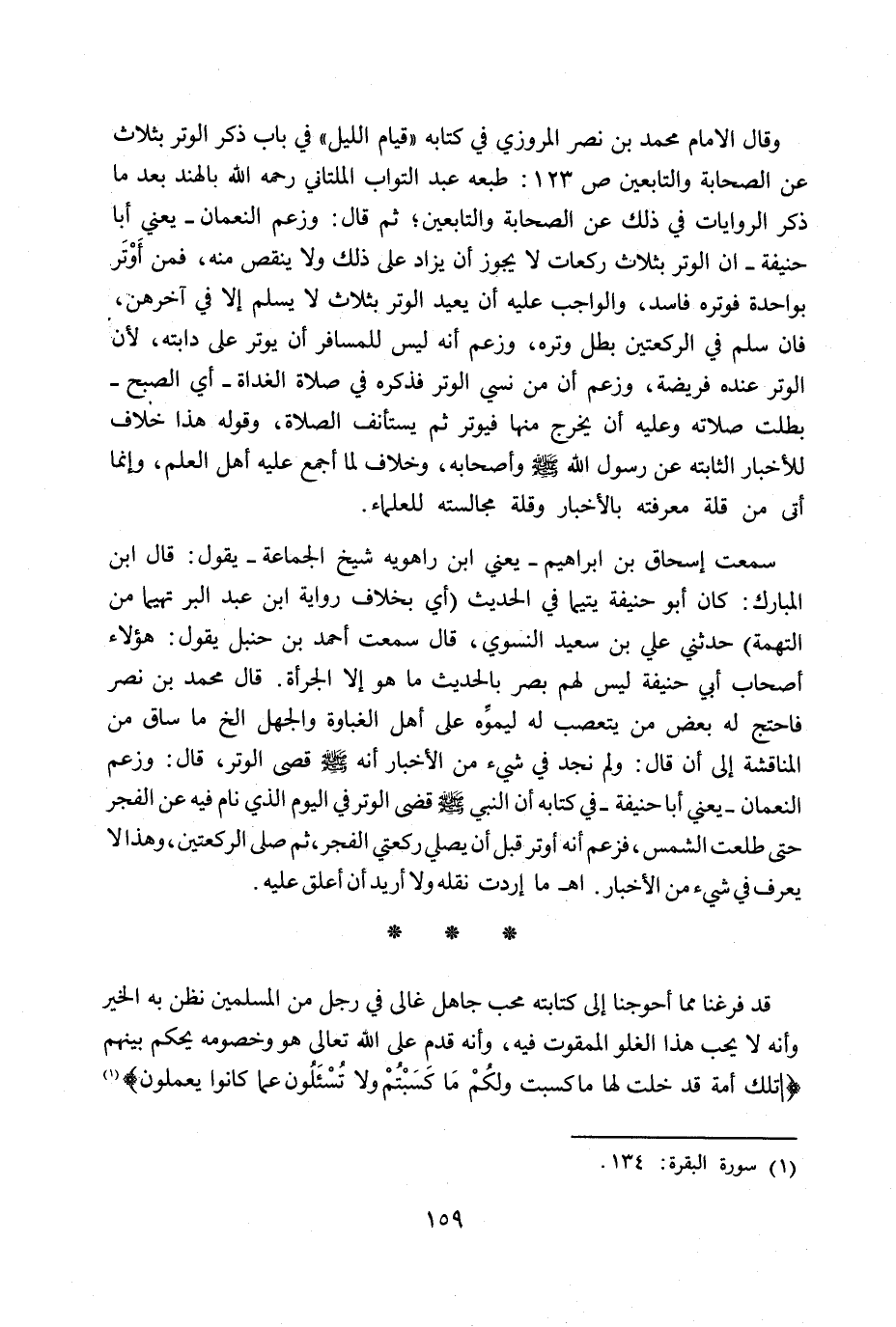 وقال الإمام محمد بن نصر المروزي في كتابه "قيام الليل" في باب ذكر الوتر بثلاث