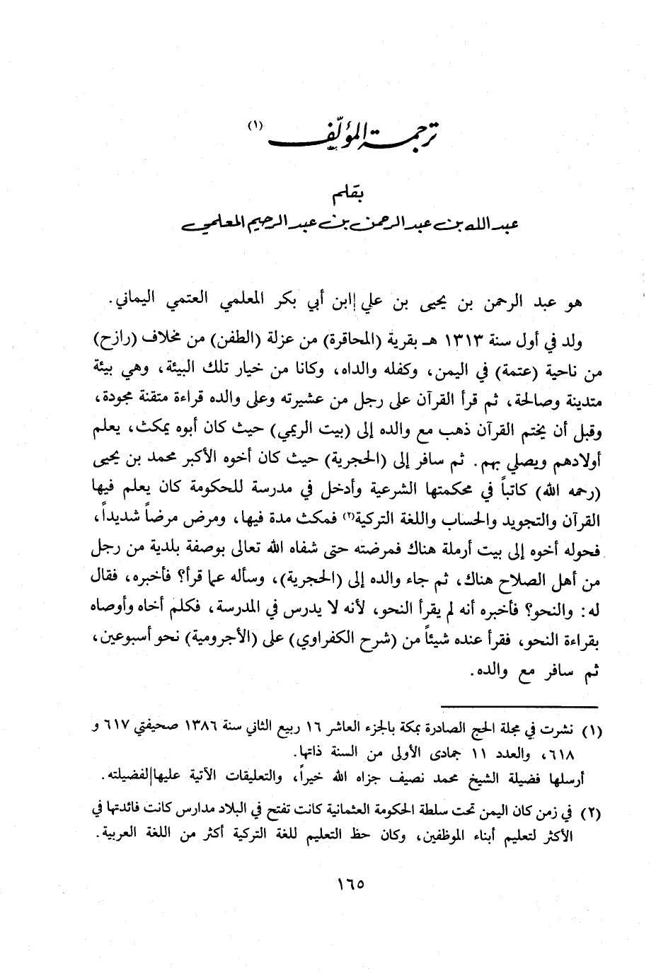 (1) نشرت في مجلة الحج الصادرة بمكة بالجزء العاشر 16 ربيع الثاني سنة 1386 صحيفتي 617 و618 والعدد 11 جمادى الأولى من السنة ذاتها.