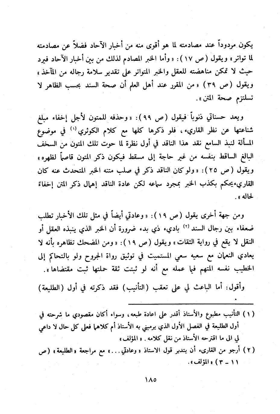 ومن جهة أخرى يقول ص 19 «وعادة أيضاً في مثل تلك الأخبار تطلب ضعفاء بين رجال السند (2) بادئ ذي بدء ضرورة أن الخبر الذي ينبذه العقل أو النقل لا يقع في رواية الثقات» ويقول ص 19 «ومن المضحك تظاهره بأنه لا يعادي النعمان مع سعيه سعي المستميت في توثيق رواة الجروح ولو بالتحاكم إلى الخطيب نفسه المتهم فيما عمله مع أنه لو ثبتت ثقة حملتها ثبت مقتضاها» .