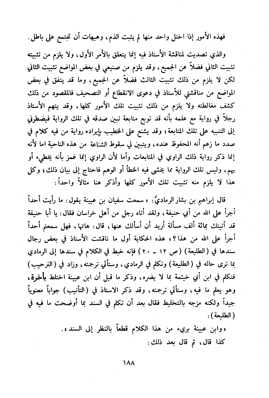 قال إبراهيم بن بشار الرمادي: سمعت بن عيينة يقول: ما رأيت أحداً أجرأ على الله من أبي حنيفة، ولقد أتاه رجل من أهل خراسان فقال يا أبا حنيفة قد أتيتك بمائة ألف مسألة أريد أن أسألك عنها، قال: هاتها، فهل سمعتم أحداً أجرأ على الله من هذا؟» هذه الحكاية أول ما ناقشت الأستاذ في بعض رجال سندها في (الطليعة) ص 12 - 20 فإنه خبط في الكلام في سندها إلى الرمادي بما ترى حاله في (الطليعة) وتكلم في الرمادي وستأتي ترجمته وزاد في (الترحيب) فتكلم في ابن أبي خثيمة بما لا يضره، وذكر ما قيل أن ابن عيينة اختلط بأخرة، وهو يعلم ما فيه وستأتي ترجمته وقد ذكر الأستاذ في (التأنيب) جواباً معنوياً جيداً ولكنه مزجه بالتخليط فقال بعد أن تكلم في السند بما أوضحت ما فيه في (الطليعة) :
