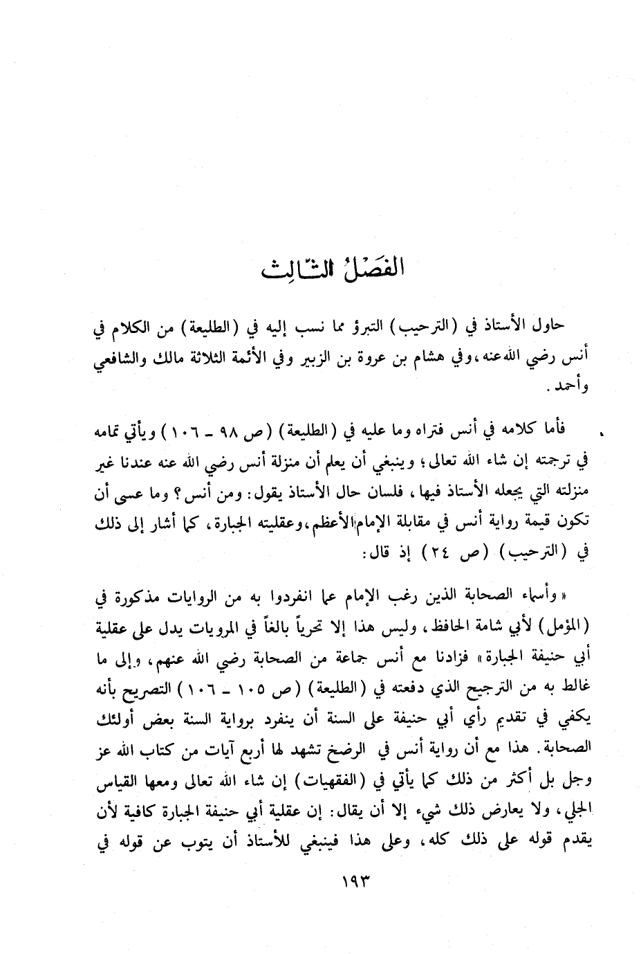 فأما كلامه في أنس فتراه وما عليه في (الطليعة) ص 98 - 106 ويأتي تمامه في ترجمته إن شاء الله تعالى. وينبغي أن يعلم أن منزلة أنس رَضِيَ اللَّهُ عَنْهُ عندنا غير منزلته التي يجعله الأستاذ فيها، فلسان حال الأستاذ يقول: ومن أنس؟ وما عسى أن تكون قيمة رواية أنس في مقابلة الإمام الأعظم وعقليته الجبارة، كما أشار إلى ذلك في (الترحيب) ص 24 إذ قال: «وأسماء الصحابة الذين رغب الإمام عما انفردوا به من الروايات مذكورة في (المؤمل) لأبي شامة الحافظ، وليس هذا إلا تحرياً بالغاً في المرويات يدل على عقلية أبي حنيفة الجبارة» فزادنا مع أنس جماعة من الصحابة رَضِيَ اللهُ عَنْهُمْ وإلى ما غالط به من الترجيح الذي دفعته (الطليعة) ص105 - 106 التصريح بأنه يكفي في تقديم رأي أبي حنيفة على السند أن ينفرد برواية السنة بعض أولئك الصحابة. هذا مع أن رواية أنس في الرضخ تشهد لها أربع آيات من كتاب الله عز وجل بل أكثر من ذلك كما يأتي في (الفقهيات) إن شاء الله تعالى ومعها القياس الجلي، ولا يعارض ذلك شيء إلا أن يقال: إن عقلية أبي حنيفة الجبارة كافية لأن يقدم قوله على ذلك كله، وعلى هذا فينبغي للأستاذ أن يتوب عن قوله في
