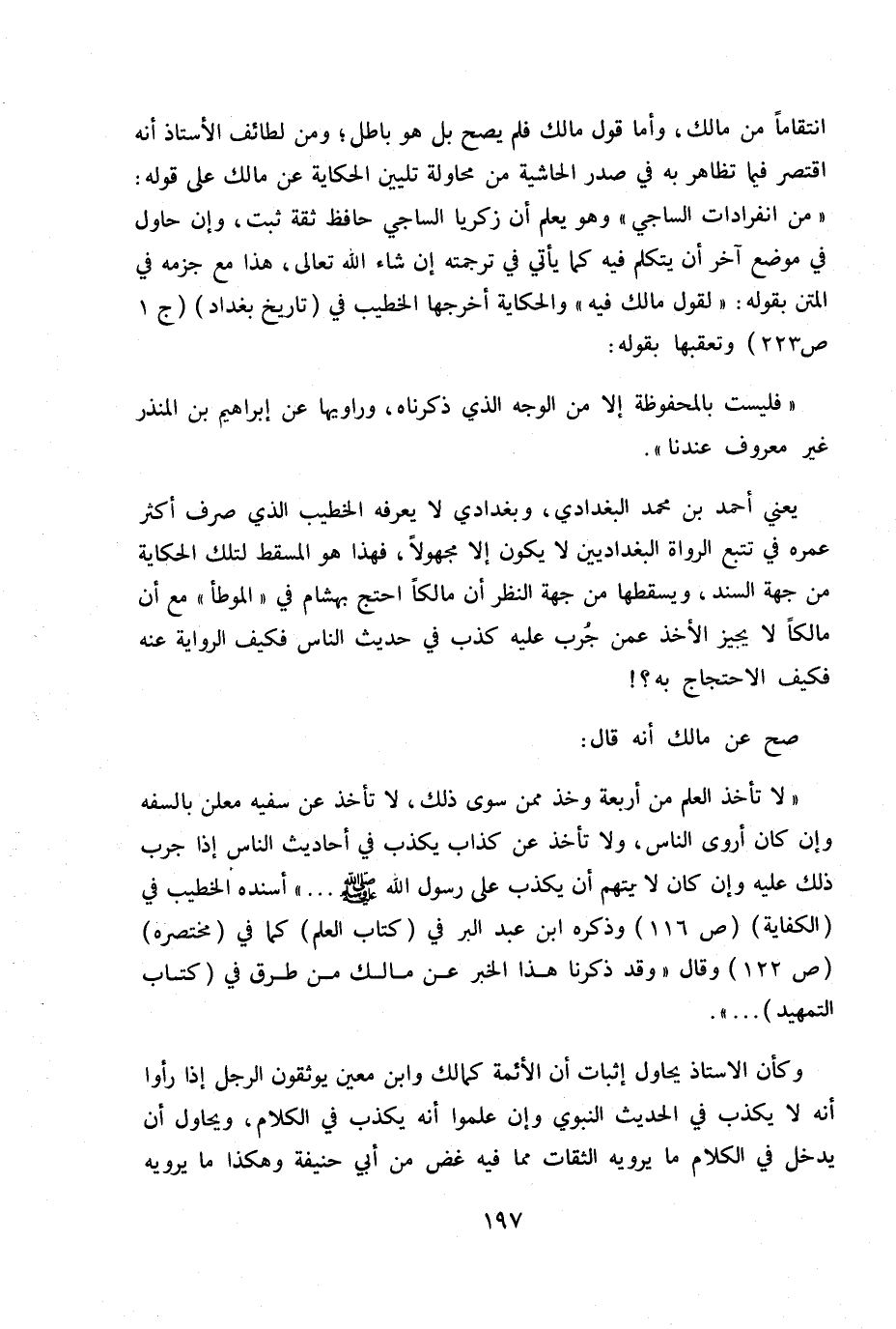 «لا تأخذ العلم من أربعة وخذ ممن سوى ذلك، لا تأخذ عن سفيه معلن بالسفه وإن كان أروى الناس، ولا تأخذ عن كذاب يكذب في أحاديث الناس إذا جرب ذلك عليه وإن كان لا يتهم أن يكذب على رَسُولُ اللَّهِ صَلَّى اللهُ عَلَيْهِ وَسَلَّمَ ... » أسنده الخطيب في (الكفاية) ص 116 وذكره ابن عبد البر في (كتاب العلم) كما في (مختصره) ص 122 وقال: «وقد ذكرنا هذا الخبر عن مالك من طرق في كتاب التمهيد ... » .