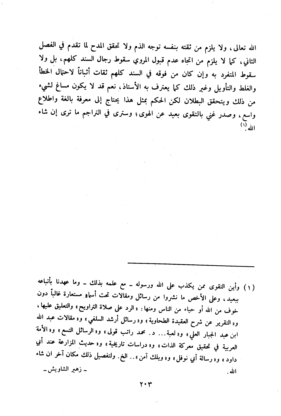 (1) وأين التقوى ممن يكذب على الله ورسوله - مع عمله بذلك - وما عهدنا بأتباعه ببعيد، وعلى الأخص ما نشروا من رسائل ومقالات تحت أسماء مستعارة غالبا دون خوف من الله أو حياء من الناس ومنها: "الرد على صلاة التراويح" والتعليق عليها، و"التقرير عن شرح العقيدة الطحاوية" و"رسائل أرشد السلفي" و"مقالات عبد الله ابن عبد الجبار العلي" و"لعبة ... د. محمد راتب قولي" و"الرسائل التسع" و"الأمة العربية في تحقيق معركة الذات" و"دراسات تاريخية" و"حديث المزارعة عند أبي داود" و"رسائل أبي نوفل" و"ويلك آمن" ... إلخ. ولتفصيل ذلك مكان آخر إن شاء الله. زهير الشاويش.