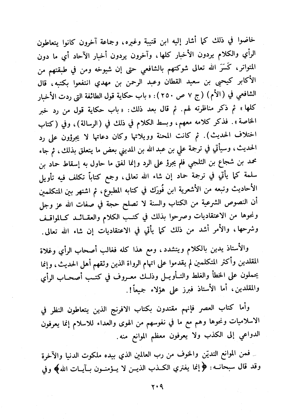 خاضوا في ذلك كما أشار إليه ابن قتيبة وغيره، وجماعة آخرون كانوا يتعاطون الرأي والكلام يردون الأخبار كلها، وآخرون يريدون أخبار الآحاد أي ما دون المتواتر، كسر الله تعالى شوكتهم بالشافعي حتى أن شيوخه ومن في طبقتهم من الأكابر كيحيى بن سعيد القطان وعبد الرحمن بن مهدي انتفعوا بكتبه قال الشافعي في (الأم) ج 7 ص 250 «باب حكاية قول الطائفة التي ردت الأخبار كلها» ثم ذكر مناظرته لهم. ثم قال بعد ذلك: «باب حكاية قول من رد خبر الخاصة» فذكر كلامه معهم. وبسط الكلام في ذلك في (الرسالة) ، وفي (كتاب اختلاف الحديث) .
