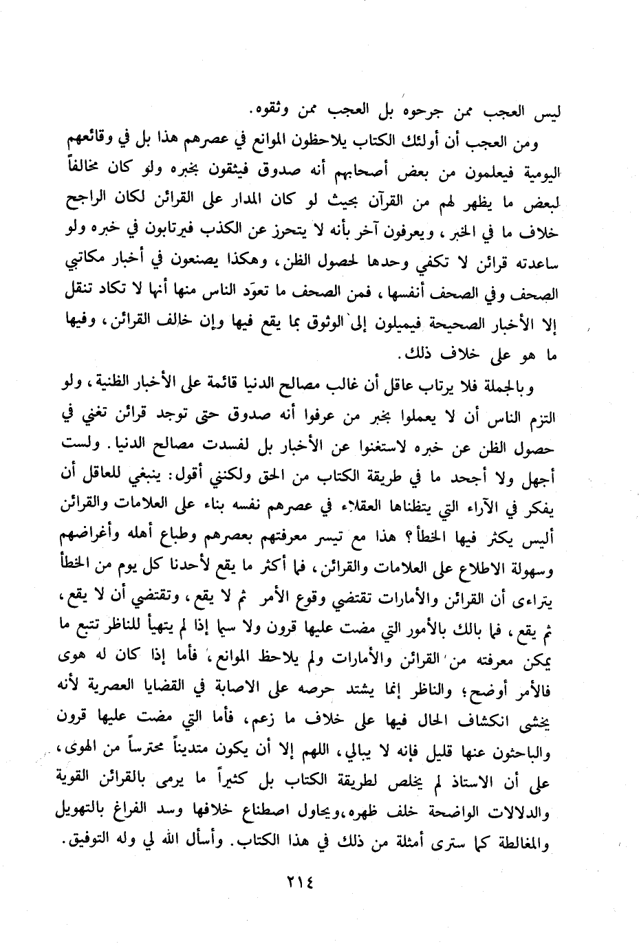 ولست أجهل ولا أجحد ما في طريقة الكتاب من الحق ولكني أقول: ينبغي للعاقل أن يفكر في الآراء التي يتظناها العقلاء في عصرهم نفسه بناء على العلامات والقرائن أليس يكثر فيها الخطأ؟ هذا مع تيسر معرفتهم بعصرهم وطباع أهله وأغراضهم وسهو لة الإطلاع على العلامات والقرائن، فما أكثر ما يقع لأحدنا كل يوم من الخطأ يتراءى أن القرائن والأمارات تقتضي وقوع العمر ثم لا يقع، وتقتضي أن لا يقع، ثم يقع، فما بالك بالأمور التي مضت عليها قرون ولا سيما إذا لم يتهيأ للناظر تتبع ما يمكن معرفته من القرائن والأمارات ولم يلاحظ الموانع، فأما إذا كان له هوى فالأمر أوضح. والناظر إنما يشتد حرصه على الإصابة في القضايا العصرية لأنه يخشى انكشاف الحال فيها على خلاف ما زعم، فأما التي مضت عليها قرون والباحثون عنها قليل فإنه لا يبالي، اللهم إلا أن يكون متديناً محترساً من الهوى، على أن الأستاذ لم يخلص لطريقة الكتاب بل كثيراً ما يرمي بالقرائن القوية والدلالات الواضحة خلف ظهره ويحاول اصطناع خلافها وسد الفراغ بالتهويل والمغالطة كما سترى أمثلة من ذلك في هذا الكتاب وأسال الله لي وله التوفيق.