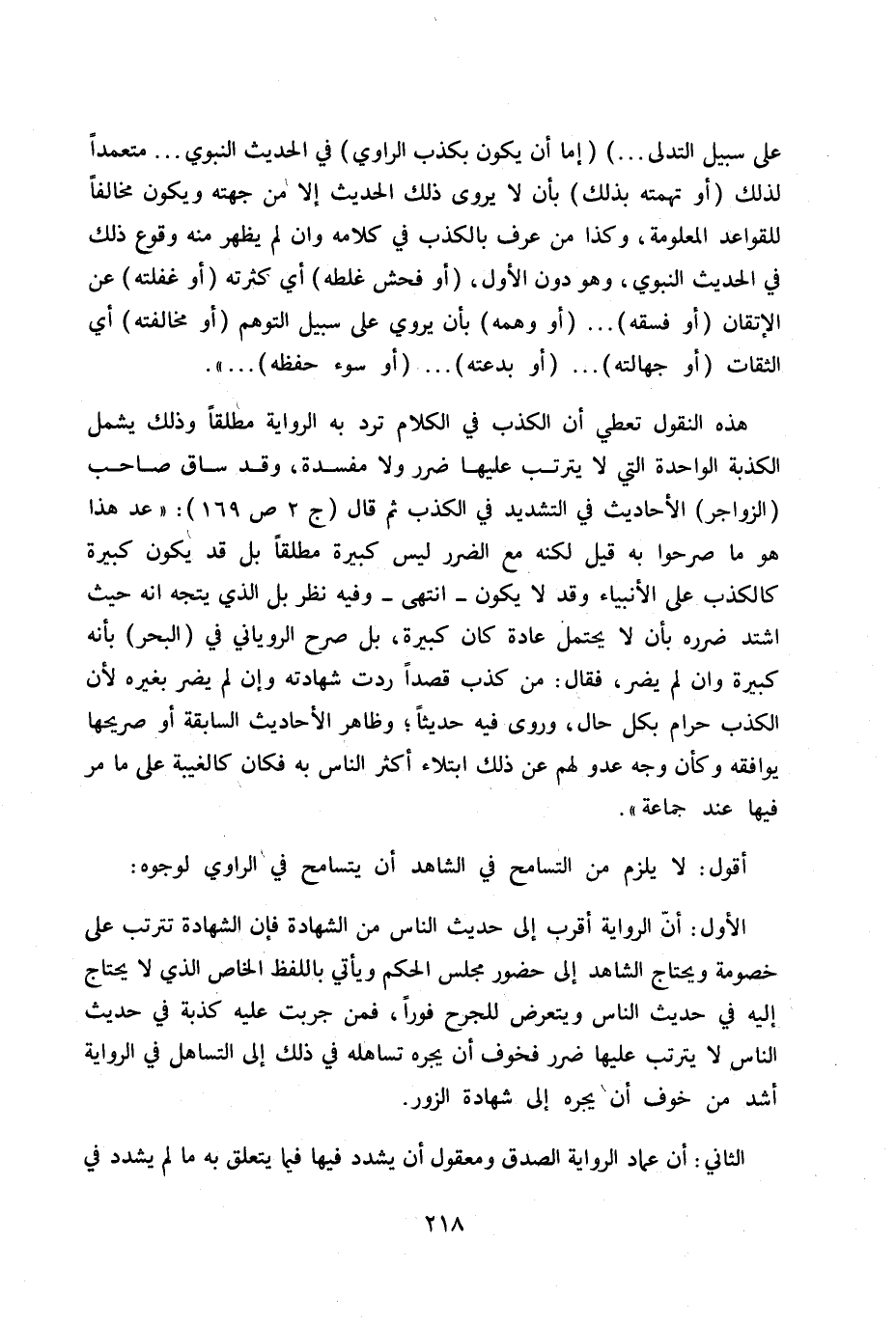 الأول: أن الرواية أقرب إلى حديث الناس من الشهادة فإن الشهادة تترتب على خصومة ويحتاج الشاهد إلى حضور مجلس الحكم ويأتي باللفظ الخاص الذي لا يحتاج إليه في حديث الناس ويتعرض للجرح فوراً، فمن جربت عليه كذبة في حديث الناس لا يترتب عليها ضرر فخوف أن يجره تساهله في ذلك إلى التساهل في الرواية أشد من خوف أن يجره إلى شهادة الزور.