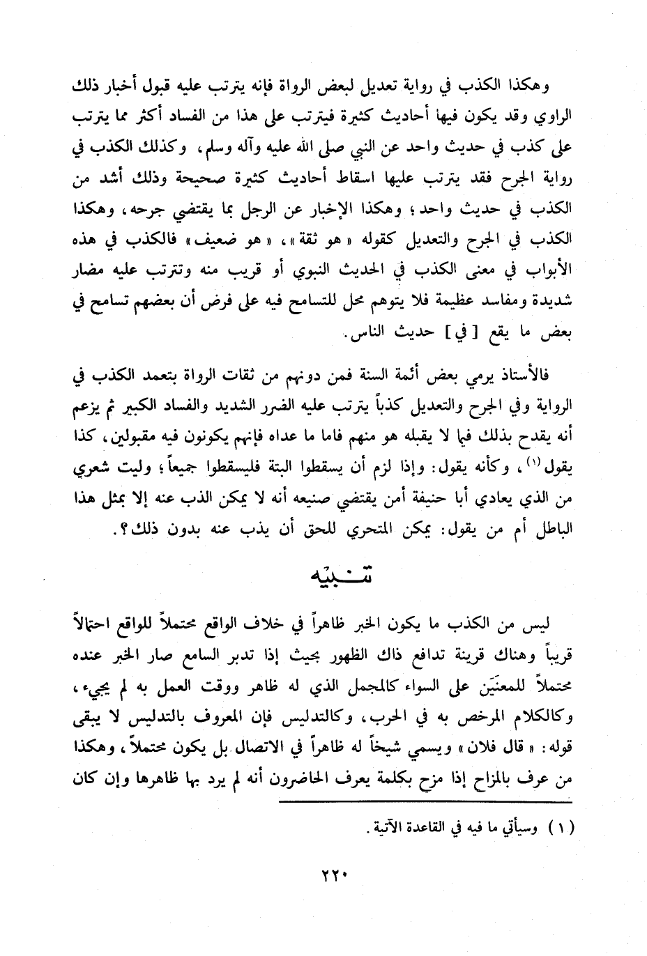 وهكذا الكذب في رواية تعديل لبعض الرواة فإنه يترتب عليه قبول أخبار ذلك الرواي وقد يكون فيها أحاديث كثيرة فيترتب على هذا من الفساد أكثر مما يترتب على كذب في حديث واحد عن النبي صلى الله عليه وآله وسلم، وكذلك الكذب في رواية الجرح فقد يترتب عليها إسقاط أحاديث كثيرة صحيحة وذلك أشد من الكذب في حديث واحد. وهكذا الإخبار عن الرجل بما يقتضي جرحه. وهكذا الكذب في الجرح والتعديل كقوله «هو ثقة» «هو ضعيف» فالكذب في هذه الأبواب في معنى الكذب في الحديث النبوي أو قريب منه وتترتب عليه مضار شديدة ومفاسد عظيمة فلا يتوهم محل للتسامح فيه على فرض أن بعضهم تسامح في بعض ما يقع [في] حديث الناس.
