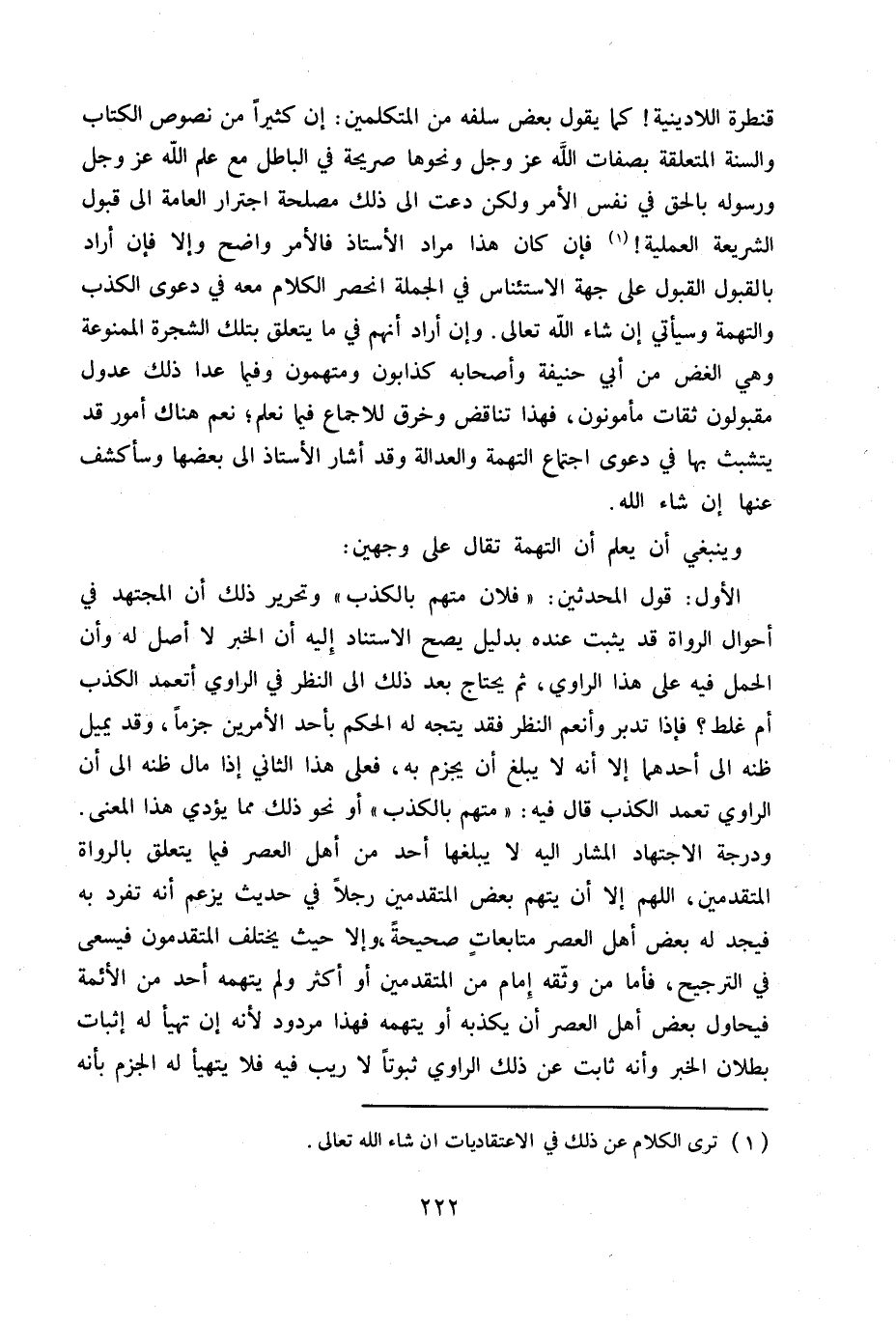 قنطرة اللادينية! كما يقول بعض سلفه من المتكلمين: إن كثيراً من نصوص الكتاب والسنة المتعلقة بصفات الله عز وجل ونحوها صريحة في الباطل مع علم الله عز وجل ورسوله بالحق في نفس الأمر ولكن دعت إلى ذلك مصلحة اجترار العامة إلى قبول الشريعة العملية! (1) فإن كان هذا مراد الأستاذ فالأمر واضح وإلا فإن أراد بالقبول القبول على جهة الاستئناس في الجملة انحصر الكلام معه في دعوى الكذب والتهمة وسيأتي إن شاء الله تعالى. وإن أراد أنهم في ما يتعلق بتلك الشجرة الممنوعة وهي الغض من أبي حنيفة وأصحابه كذابون ومتهمون وفيما عدا ذلك عدول مقبولون ثقات مأمونون، فهذا تناقض وخرق للإجماع فيما نعلم. نعم هناك أمور قد يتشبث بها في دعوى التهمة والعدالة وقد أشار الأستاذ إلى بعضها وسأكشف عنها إن شاء الله.