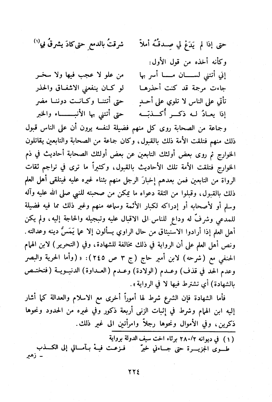 وجماعة من الصحابة روى كل منهم فضيلة لنفسه يرون أن على الناس قبول ذلك منهم فتلقت الأمة ذلك بالقبول، وكان من الصحابة والتابعين يقاتلون الخوارج ثم روى بعض أولئك التابعين عن بعض أولئك التابعين عن بعض أولئك الصحابة أحاديث في ذم الخوارج فتلقت الأمة تلك الأحاديث بالقبول، وكثيراً ما ترى في تراجم ثقات الرواة من التابعين فمن بعدهم إخبار الرجل منهم بثناء غيره عليه فيتلقى أهل العلم ذلك بالقبول، وقبلوا من الثقة دعواه ما يمكن من صحبته للنبي صلى الله عليه وآله وسلم أو لأصحابه أو إدراكه لكبار الأئمة وسماعه منهم وغير ذلك مما فيه فضيلة للمدعي وشرف له وداع للناس إلى الإقبال عليه وتبجيله والحاجة إليه، ولم يكن أهل العلم إذا أرادوا الاستيثاق من حال الرواي يسألون إلا عما يمس دينه وعدالته. ونص أهل العلم على أن الرواية في ذلك مخالفة للشهادة، وفي (التحرير) لابن الهمام الحنفي مع (شرحه) لابن أمير حاج ج3 ص 245: «وأما الحرية والبصر وعدم الحد في قذف) وعدم (الولادة) وعدم (العداوة) الدنيوية (فتختص بالشهادة) أي تشترط فيها لا في الرواية» .