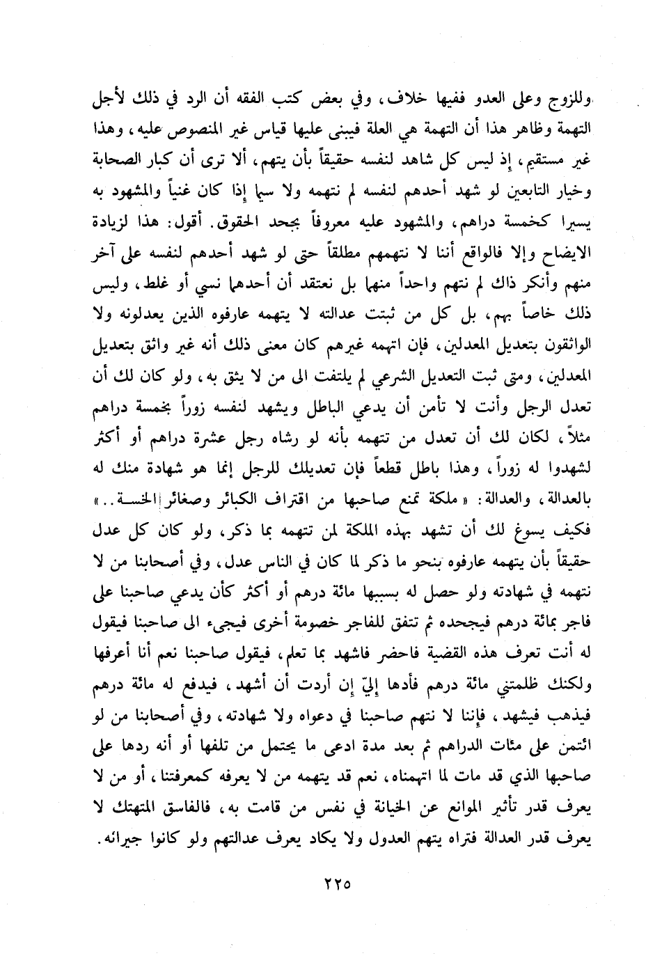 [فأما الشهادة للنفس فمتفق على أنها لا تقبل، وأما الشهادة للأصل وللفرع] (*) وللزوج وعلى العدو ففيها خلاف، وفي بعض كتب الفقه أن الرد في ذلك لأجل التهمة وظاهر هذا أن التهمة هي العلة فيبني عليها قياس غير المنصوص عليه، وهذا غير مستقيم، إذ ليس كل شاهد لنفسه حقيقا: بأن يتهم، ألا ترى أن كبار الصحابة وخيار التابعين لو شهد أحدهم لنفسه لم نتهمه ولا سيما إذا كان غنياً والمشهود به يسيراً كخمسة دراهم، والمشهود عليه معروفاً بجحد الحقوق. أقول هذا لزيادة الإيضاح وإلا فالواقع أننا لا نتهمهم مطلقاً حتى لو شهد أحدهم لنفسه على آخر منهم وأنكر ذاك لم نتهم واحداً منهما بل نعتقد أن أحدهما نسي أو غلط، وليس ذلك خاصاً بهم، بل كل من ثبتت عدالته لا يتهمه عارفوه الذين يعدلونه ولا الواثقون بتعديل المعدلين، فإن اتهمه غيرهم كان معنى ذلك أنه غير واثق بتعديل المعدلين، ومتى ثبت التعديل الشرعي لم يلتفت إلى من لا يثق به، ولو كان لك أن تعدل الرجل وأنت لا تأمن أن يدعي الباطل ويشهد لنفسه زوراً بخمسة دراهم مثلاً، لكان لك أن تعدل من تتهمه بأنه لو رشاه رجل عشرة دراهم أو أكثر لشهدوا له زوراً، وهذا باطل قطعاً فان تعديلك للرجل إنما هو شهادة منك له بالعدالة، والعدالة «ملكة تمنع صاحبها من اقتراف الكبائر وصغائر الخسة ... » فكيف يسوغ لك أن تشهد بهذه الملكة لمن تتهمه بما ذكر، ولو كان كل عدل حقيقياً بأن يتهمه عارفوه بنحو ما ذكر لما كان في الناس عدل، وفي أصحابنا من لا نتهمه في شهادته ولو حصل له بسببها مائة درهم أو أكثر كأن يدعي صاحبنا على فاجر بمائة درهم فيجحده ثم تتفق للفاجر خصومة أخرى فيجيء إلى صاحبنا فيقول له أنت تعرف هذه القضية فاحضر فاشهد بما تعلم، فيقول صاحبنا نعم أنا أعرفها ولكنك ظلمتني مائة درهم فأدها إلي إن أردت أن أشهد، فيدفع له مائة درهم فيذهب فيشهد، فإننا لا نتهم صاحبنا في دعواه ولا شهادته، وفي أصحابنا من لو ائتمن على مئات الدراهم ثم بعد مدة ادعى ما يحتمل من تلفها أو أنه ردها على صاحبها الذي قد مات لما اتهمناه، نعم قد يتهمه من لا يعرفه كمعرفتنا، أو من لا يعرف قدر تأثير الموانع عن الخيانة في نفس من قامت به، فالفاسق المتهتك لا يعرف قدر العدالة فتراه يتهم العدول ولا يكاد يعرف عدالتهم ولو كانوا جيرانه.