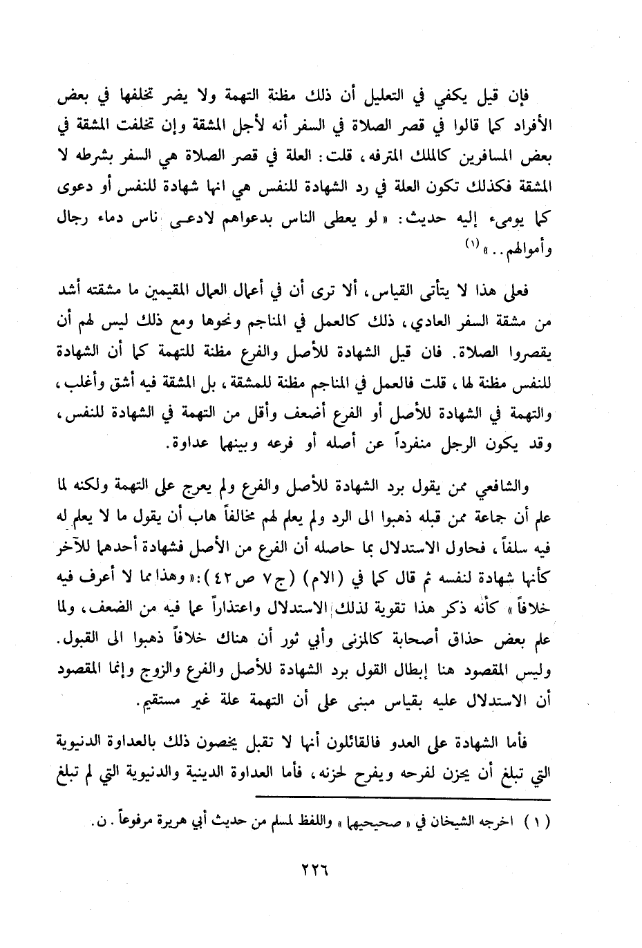 والشافعي ممن يقول برد الشهادة للأصل والفرع ولم يعرج على التهمة ولكنه لما علم أن جماعة ممن قبله ذهبوا إلى الرد ولم يعلم لهم مخالفاً هاب أن يقول ما لا يعلم له فيه سلفاً، فحاول الاستدلال بما حاصله أن الفرع من الأصل فشهادة أحدهما للآخر كأنها شهادة لنفسه ثم قال كما في (الأم) ج 7 ص 42: «وهذا مما لا أعرف فيه خلافاً» كأنه ذكر هذا تقوية لذاك الاستدلال واعتذاراً عما فيه من الضعف، ولما علم بعض حذاق أصحابه كالمزني وأبي ثور أن هناك خلافاً ذهبوا إلى القبول. وليس المقصود هنا إبطال القول برد الشهادة للأصل والفرع والزوج وإنما المقصود أن الاستدلال عليه بقياس مبني على أن التهمة على غير مستقيم. فأما الشهادة على العدو فالقائلون أنها لا تقبل يخصون ذلك بالعداوة الدنيوية التي تبلغ أن يحزن لفرحه ويفرح لحزنه، فأما العداوة الدينية والدنيوية التي لم تبلغ