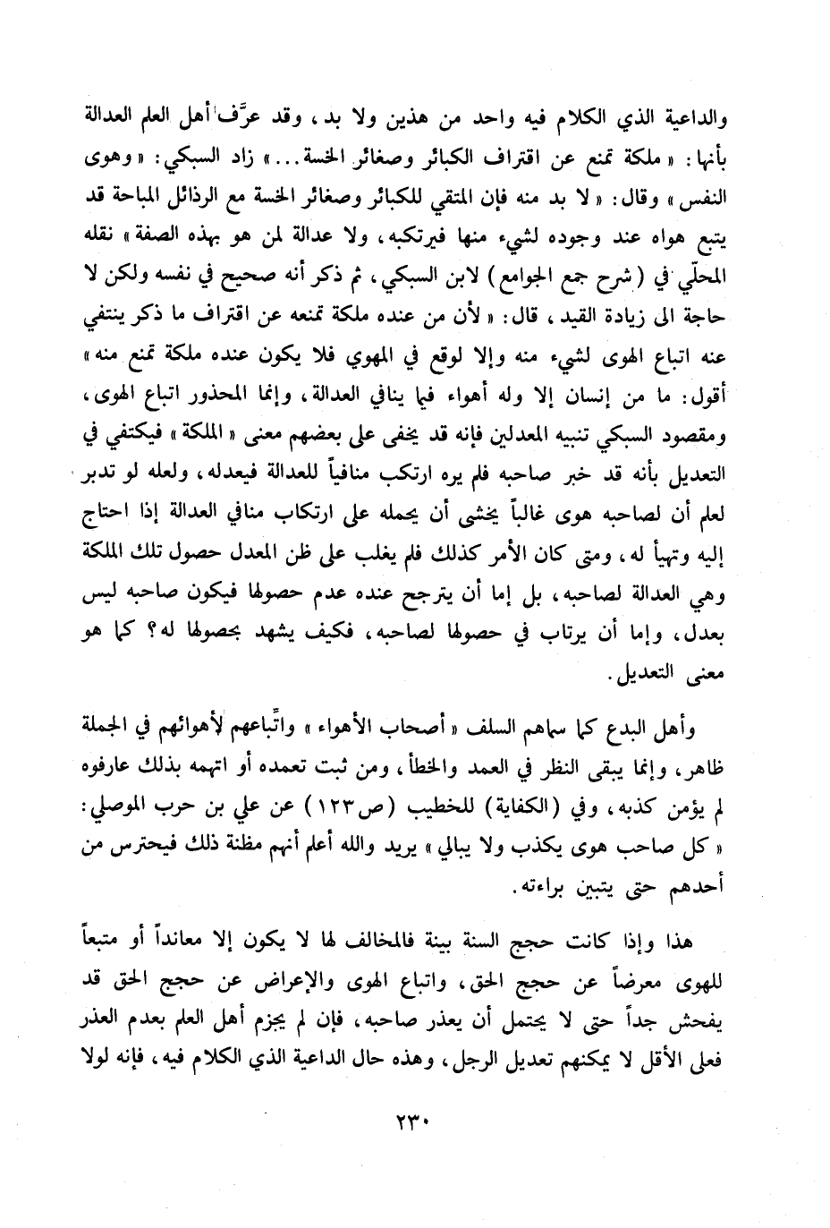 والداعية الذي الكلام فيه واحد من هذين ولا بد، وقد عرف لأهل العلم العدالة بأنها «ملكة تمنع عن اقتراف الكبائر وصغائر الخسة ... » زاد السبكي «وهوى النفس» وقال «لا بد منه فإن المتقى للكبائر وصغائر الخسة مع الرذائل المباحة قد يتبع هواه عند وجوده لشيء منها فيرتكبه ولا عدالة لمن هو بهذه الصفة» نقله المحلي في (شرح جمع الجوامع) لابن السبكي ثم ذكر أنه صحيح في نفسه ولكن لا حاجه إلى زيادة القيد قال «لأن من عنده ملكة تمنعه عن اقتراف ما ذكر ينتفي عنه إتباع الهوى لشيء منه وإلا لوقع في المهوي فلا يكون عنده ملكة تمنع منه» أقول: ما من إنسان إلا وله أهو اء فيما ينافي العدالة وإنما المحذور إتباع الهوى ومقصود السبكي تنبيه المعدلين فإنه قد يخفى على بعضهم معنى «الملكة» فيكتفي في التعديل بأنه قد خبر صاحبه فلم يره ارتكب منافيا للعدالة فيعدله ولعله لو تدبر لعلم أن لصاحبه هوى غالبا يخشى أن يحمله على ارتكاب منافي العدالة إذا احتاج إليه وتهيأ له ومتى كان الأمر كذلك فلم يغلب على ظن المعدل حصول تلك الملكة وهي العدالة لصاحبه بل إما أن يترجح عنده عدم حصولها فيكون صاحبه ليس بعدل وإما أن يرتاب في حصولها لصاحبه فكيف يشهد بحصولها له؟ كما هو معنى التعديل.