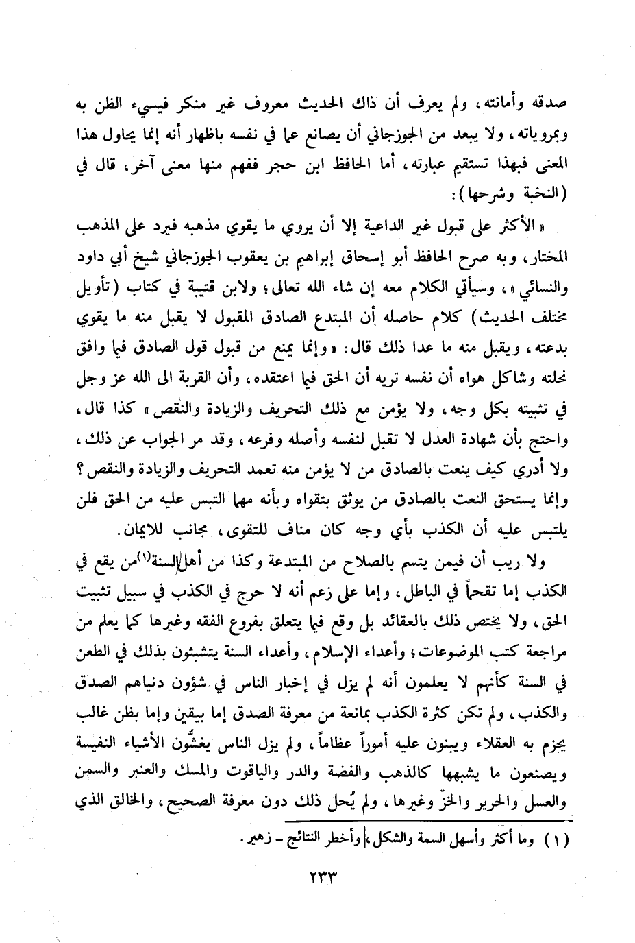 صدقه وأمانته ولم يعرف أن ذاك الحديث معروف غير منكر فيسيء الظن به بمروياته ولا يبعد من الجوزجاني أن يصانع عما في نفسه بإظهار أنه أنما يحاول هذا المعنى فبهذا تستقيم عبارته، أما الحافظ ابن حجر ففهم منها معنى آخر، قال في (النخبة وشرحها) : «الأكثر على قبول غير الداعية إلا أن ما يقوي مذهبه فيرد على المذهب المختار، وبه صرح الحافظ أبو إسحاق إبراهيم بن يعقوب الجوزجاني شيخ أبي داود والنسائي» وسيأتي الكلام معه إن شاء الله تعالى. ولابن قتيبة في كتاب (تأويل مختلف الحديث) كلام حاصله أن المبتدع الصادق المقبول لا يقبل منه ما يقوي بدعته، ويقبل منه ما عدا ذلك قال: «وإنما يمنع من قبول قول الصادق فيما وافق نحلته وشاكل هواه أن نفسه تريه أن الحق فيما اعتقده وأن القربة إلى الله عز وجل في تثبيته بكل وجه، ولا يؤمن مع ذلك التحريف والزيادة والنقص» كذا قال، واحتج بأن شهادة العدل لا تقبل لنفسه وأصله وفرعه، وقد مر الجواب عن ذلك، ولا أدري كيف ينعت بالصادق من لا يؤمن منه تعمد التحريف والزيادة والنقص؟ وإنما يستحق النعت بالصادق من يوثق بتقواه وبأنه مهما التبس عليه من الحق فلن يلتبس عليه أن الكذب بأي وجه كان مناف للتقوى، مجانب للإيمان.