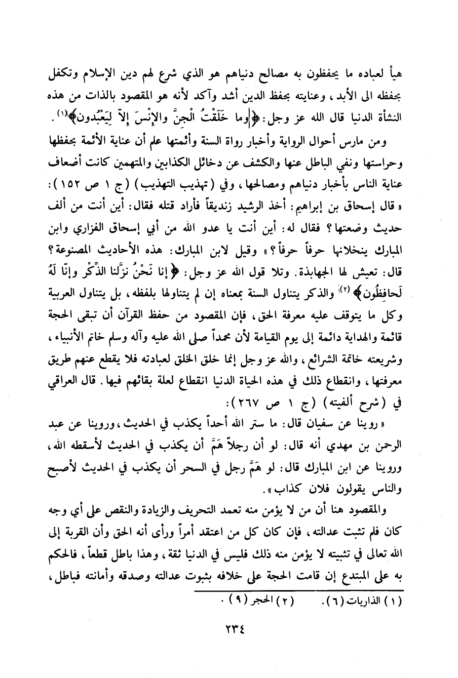 ومن مارس أحوال الرواية وأخبار رواة السنة وأئمتها علم أن عناية الأئمة بحفظها وحراستها ونفي الباطل عنها والكشف عن دخائل الكذابين والمتهمين كانت أضعاف عناية الناس بأخبار دنياهم ومصالحها، وفي (تهذيب التهذيب) ج 1 ص 152: «قال إسحاق بن إبراهيم: أخذ الرشيد زنديقاً فأراد قتله فقال: أين أنت من ألف حديث وضعتها؟ فقال له: أين أنت يا عدو الله من أبي إسحاق الفزاري وابن المبارك ينخلانها حرفاً حرفاً؟» وقيل لابن المبارك: هذه الأحاديث المصنوعة؟ قال: تعيش لها الجهابذة. وتلا قول الله عز وجل: {إِنَّا نَحْنُ نَزَّلْنَا الذِّكْرَ وَإِنَّا لَهُ لَحَافِظُونَ} . والذكر يتناول السنة بمعناه إن لم يتناولها بلفظه، بل يتناول العربية وكل ما يتوقف عليه معرفة الحق، فإن المقصود من حفظ القرآن أن تبقى الحجة قائمة والهداية دائمة إلى يوم القيامة لأن محمد صلى الله عليه وآله وسلم خاتم الأنبياء، وشريعة خاتمة الشرائع، والله عز وجل إنما خلق لعبادته فلا يقطع عنهم طريق معرفتها، وانقطاع ذلك في هذه الحياة الدنيا وانقطاع لعلة بقائهم فيها. قال العراقي في (شرح ألفيته) ج 1 ص 267: «روينا عن سفيان قال: ما ستر الله أحداً يكذب في الحديث، وروينا عن عبد الرحمن بن مهدي أنه قال: لو أن رجلا هَمَّ أن يكذب في الحديث لأسقطه الله، وروينا عن ابن المبارك قال: لوهَمَّ رجل في السحر أن يكذب في الحديث لأصبح والناس يقولون فلان كذاب» .