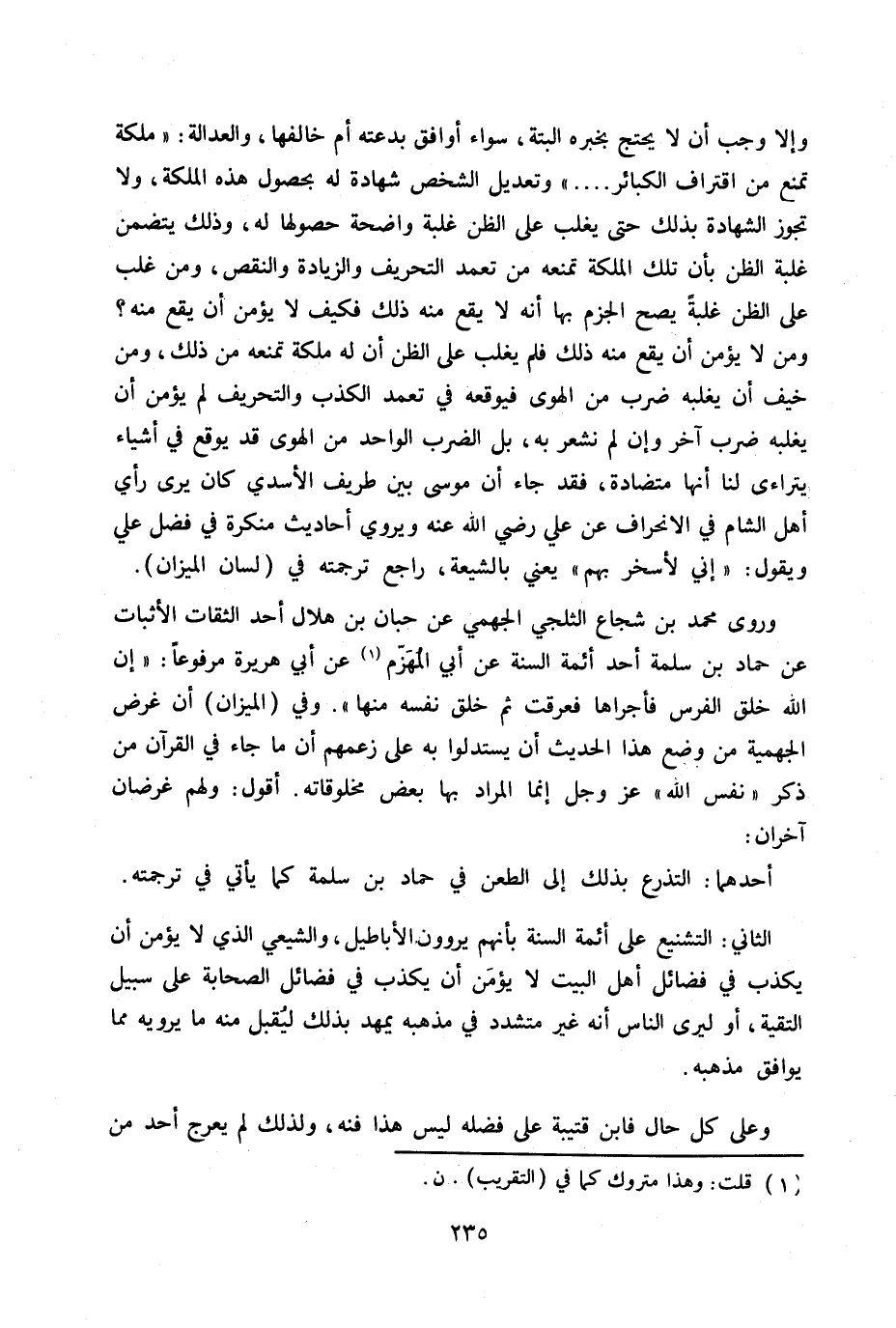 وإلا وجب أن لا يحتج بخبره البتة، سواء أوافق بدعته أم خالفها، والعدالة «ملكة تمنع من اقتراف الكبائر ... » وتعديل الشخص شهادة له بحصول هذه الملكة، ولا تجوز الشهادة بذلك حتى يغلب على الظن غلبة واضحة حصولها له، وذلك يتضمن غلبة الظن بأن تلك الملكة تمنعه من تعمد التحريف والزيادة والنقص ومن غلب على الظن غلبة يصح الجزم بها أنه لا يقع منه ذلك فكيف لا يؤمن أن يقع منه؟ ومن لا يؤمن أن يقع منه ذلك فلم يغلب على الظن أن له ملكه تمنعه من ذلك، ومن خيف أن يغلبه ضرب من الهوى فيوقعه في تعمد الكذب والتحريف لم يؤمن أن يغلبه ضرب آخر وإن لم نشعر به، بل الضرب الواحد من الهوى قد يوقع في أشياء يتراءى لنا أنها متضادة، فقد جاء أن موسى بن طريف الأسدي كان يرى رأي أهل الشام في الانحراف عن علي رضي الله عنه ويروي أحاديث منكرة في فضل علي ويقول: «إني لأسخر بهم» يعني بالشيعة، راجح ترجمته في (لسان الميزان) .