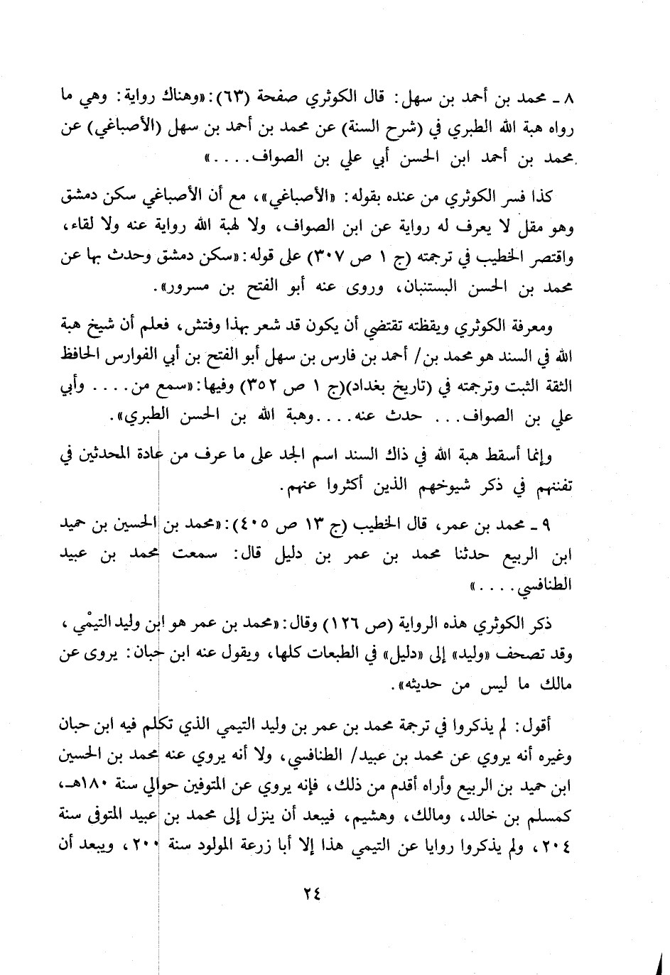 8- محمد بن أحمد بن سهل: قال الكوثري صفحة 63 «وهناك رواية: وهي ما رواه هبة الله الطبري في (شرح السنة) عن محمد بن أحمد بن سهل (الأصباغي) عن محمد بن أحمد بن الحسن أبي علي بن الصواف ... » .