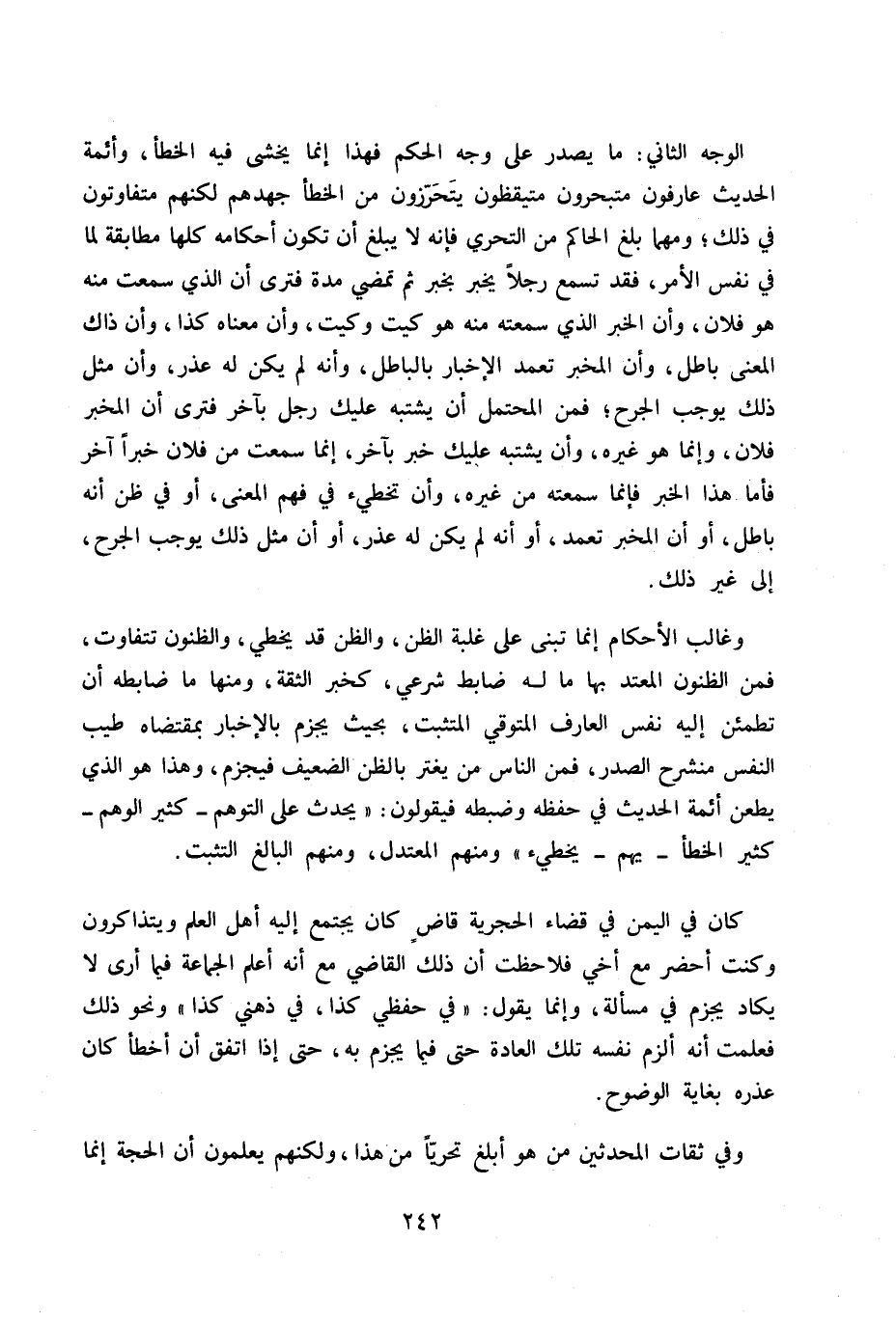 الوجه الثاني: ما يصدر على وجه الحكم فهذا إنما يخشى فيه الخطأ، وأئمة الحديث عارفون متبحرون متيقظون يتحرزون من الخطأ جهدهم لكنهم متفاوتون في ذلك. وهما بلغ الحاكم من التحري فإنه لا يبلغ أن تكون أحكامه كلها مطابقة لما في نفس الأمر. فقد تسمع رجلاً يخبر ثم تمضي مدة فترى أن الذي سمعت منه هو فلان، وأن الخبر الذي سمعته منه هو كيت وكيت، وأن معناه كذا، وأن ذاك المعنى باطل وأن المخبر تعمد الإخبار بالباطل، وأنه لم يكن له عذر وأن مثل ذلك يوجب الجرح. فمن المحتمل أن يشتبه عليك رجل بآخر فترى أن المخبر وإنما هو غيره وأن تخطيء في فهم المعنى، أو في ظن أنه باطل، أو أن المخبر تعمد، أو أنه لم يكن له عذر، أو أن مثل ذلك يوجب الجرح إلى غير ذلك. وغالب الأحكام إنما تبني على غلبة الظن، والظن قد يخطئ، والظنون تتفاوت، فمن الظنون المعتد بها ما له ضابط شرعي، كخبر الثقة، ومنها ما ضابطه أن تطمئن إليه نفس العارف المتوقي المتثبت بحيث يجزم بالإخبار بمقتضاه طيب النفس منشرح الصدر، فمن الناس من يغتر بالظن الضعيف فيجزم، وهذا هو الذي يطعن أئمة الحديث في حفظه وضبطه فيقولون: «يحدث على التوهم - كثير الوهم - كثير الخطأ - يهم - يخطئ» ومنهم لمعتدل، ومنهم البالغ التثبت. كان في اليمن في قضاء الحجرية قاض كان يجتمع إليه أهل العلم ويتذاكرون وكنت أحضر مع أخي فلاحظت أن ذلك القاضي مع أنه أعلم الجماعة فيما أرى لا يكاد يجزم في مسألة، وإنما يقول: «في حفظي كذا، في ذهني كذا» ونحو ذلك فعلمت أنه ألزم نفسه تلك العادة حتى فيما يجزم به، حتى إذا اتفق أن أخطأ كان عذره بغاية الوضوح، وفي ثقات المحدثين من هو أبلغ تحرياً من هذا ولكنهم يعلمون أن الحجة إنما