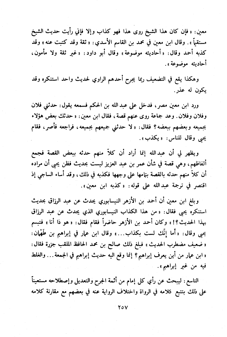 وبلغ ابن معين أن أحمد بن الأزهر النيسابوري يحدث عن عبد الرزاق بحديث استنكره يحيى فقال: «من هذا الكذاب النيسابوري الذي يحدث عن عبد الرزاق بهذا الحديث؟!» وكان أحمد بن الأزهر حاضراً فقام فقال: «هو ذا أنا» فتبسم يحيى وقال: «أما إنك لست بكذاب ... » وقال ابن عمار في إبراهيم بن طهمان «ضعيف مضطرب الحديث» فبلغ ذلك صالح بن محمد الحافظ الملقب جزرة فقال: «ابن عمار من أين يعرف إبراهيم؟ إنما وقع إليه حديث إبراهيم في الجمعة.. والغلط فيه من غير إبراهيم» .