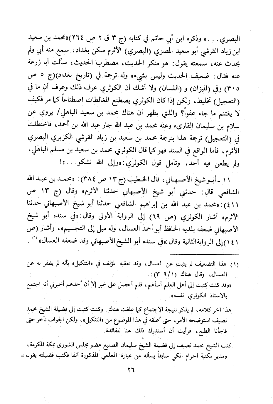 البصري ... » وذكره ابن أبي حاتم في كتابه (ج 3 ق2 ص 264) «محمد بن سعيد بن زياد القرشي أبو سعيد المصري (البصري) الأثرم سكن بغداد، سمع منه أبي ولم يحدث عنه، سمعته يقول: هو منكر الحديث مضطرب الحديث، سألت أبا زرعة عنه فقال: ضعيف الحديث وليس بشيء» وله ترجمة في (تاريخ بغداد) ج 5 ص 305 وفي (الميزان) و (اللسان) ، ولا أشك أن الكوثري عرف ذلك وعرف أن ما في (التعجيل) تخليط ولكن إذا كان الكوثري يصطنع المغالطات اصطناعاً كما مرَّ فكيف لا يغتنم ما جاء عفواً والذي يظهر أن هناك محمد بن سعيد الباهلي يروي عن سلام بن سليمان القارئ وعنه محمد بن سعيد بن زياد جار عبد الله بن أحمد فاختلط في (التعجيل) ترجمة هذا بترجمة محمد بن سعيد بن زياد القرشي الكزبري البصري الأثرم، فأما الواقع في السند فهو كما قال الكوثري محمد بن سعيد بن سلم الباهلي، ولم يطعن فيه أحد، وتأمل قول الكوثري: «وإلى الله نشكو ... » !