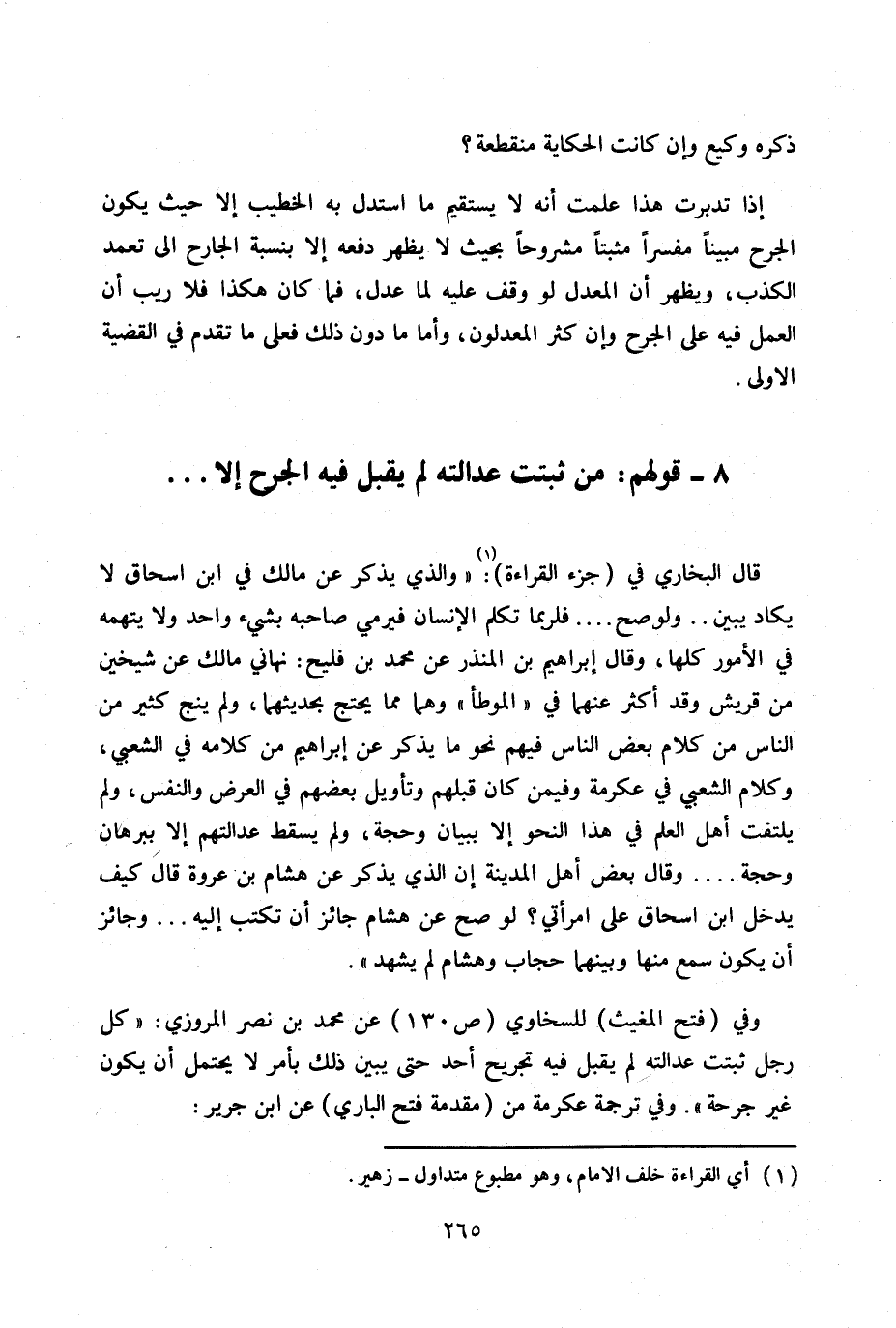 وفي (فتح المغيث) للسخاوي ص 130 عن محمد بن نصر المروزي: «كل رجل ثبتت عدالته لم يقبل فيه تجريح أحد حتى يبين ذلك بأمر لا يحتمل أن يكون غير جرحة» .