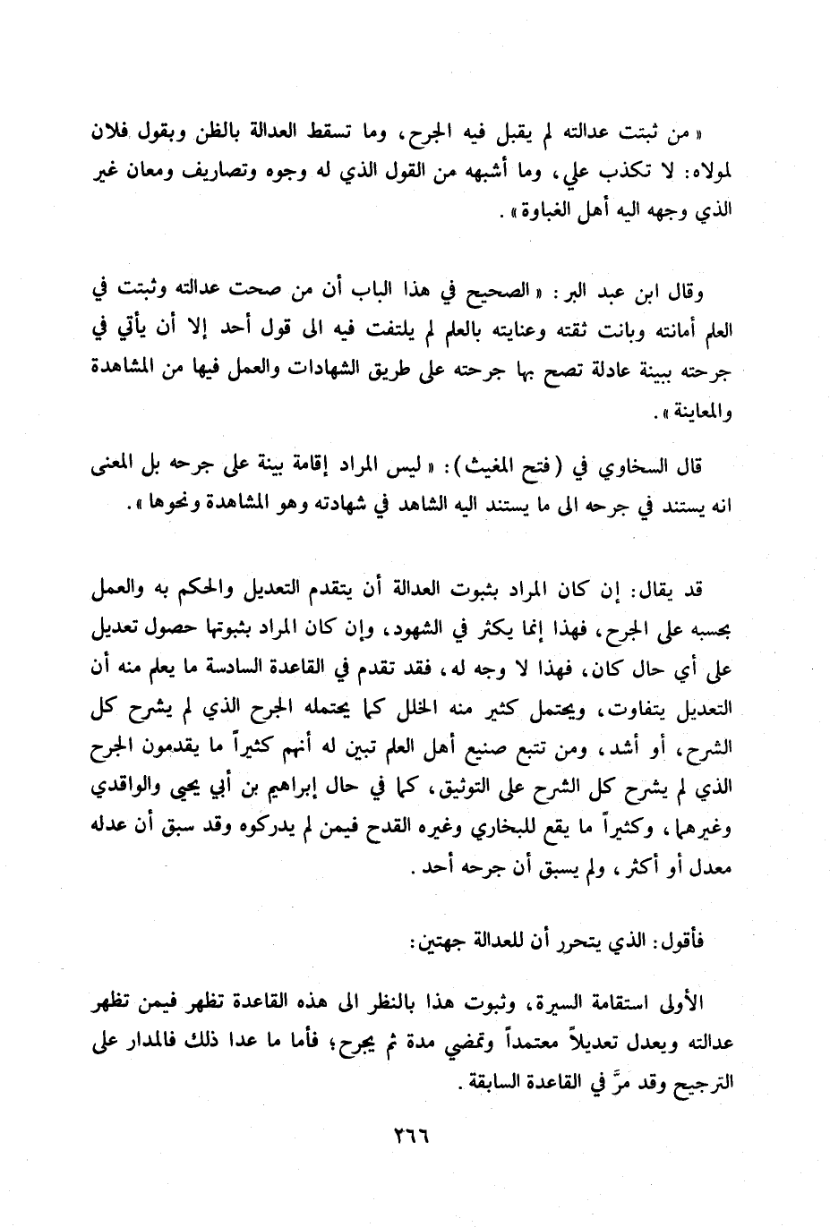 «الصحيح في هذا الباب أن من صحت عدالته وثبتت في العلم أمانته وبانت ثقته وعنايته بالعلم لم يلتفت فيه إلى قول أحد إلا أن يأتي في جرحته بينة عادلة تصح بها جرحته على طريق الشهادات والعمل فيها من المشاهدة والمعاينة» . قال السخاوي في (فتح المغيث) :.. ليس المراد إقامة بينة على جرحه بل المعنى أنه يستند في جرحه إلى ما يستند إليه الشاهد في شهادته وهو المشاهدة ونحوها» .