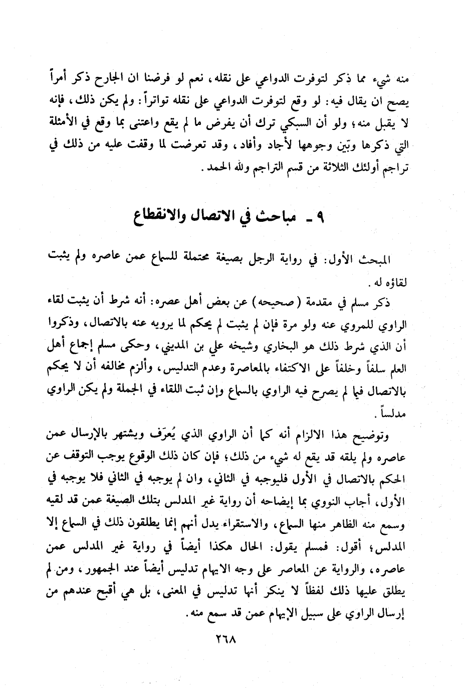 ذكر مسلم في مقدمة (صحيحه) عن بعض أهل عصره: أنه شرط أن يثبت لقاء الراوي للمروي عنه ولو مرة فان لم يثبت لم يحكم لما يرويه عنه بالاتصال، وذكروا أن الذي شرط ذلك هو البخاري وشيخه علي بن المديني، وحكى مسلم إجماع أهل العلم سلفاً وخلفاً على الاكتفاء بالمعاصرة وعدم التدليس، وألزم مخالفه أن لا يحكم بالاتصال فيما لم يصرح فيه الراوي بالسماع وإن ثبت اللقاء في الجملة ولم يكن الراوي مدلساً. وتوضيح هذا الإلزام أنه كما أن الراوي الذي يعرف ويشتهر بالارسال عمن عاصره ولم يلقه قد يقع له شيء من ذلك، فكذلك الراوي الذي لم يعرف ويشتهر بالارسال عمن لقيه وسمع منه قد يقع له شيء من ذلك. فان كان ذلك الوقوع يوجب التوقف عن الحكم بالاتصال في الأول فيوجبه في الثاني، وإن لم يوجبه في الثاني فلا يوجبه في الأول، أجاب النووي بما إيضاحه أن رواية غير المدلس بتلك الصيغة عمن قد لقيه وسمع منه الظاهر منها السماع، والاستقراء يدل أنهم إنما يطلقون ذلك في السماع إلا المدلس. أقول فمسلم يقول: الحال هكذا أيضاً في رواية غير المدلس عمن عاصره، والرواية عن المعاصر على وجه الإيهام تدليس أيضاً عند الجمهور، ومن لم يطلق عليها ذلك لفظاً لا ينكر أنها تدليس في المعنى، بل هي أقبح عندهم من إرسال الراوي على سبيل الإيهام عمن قد سمع منه.