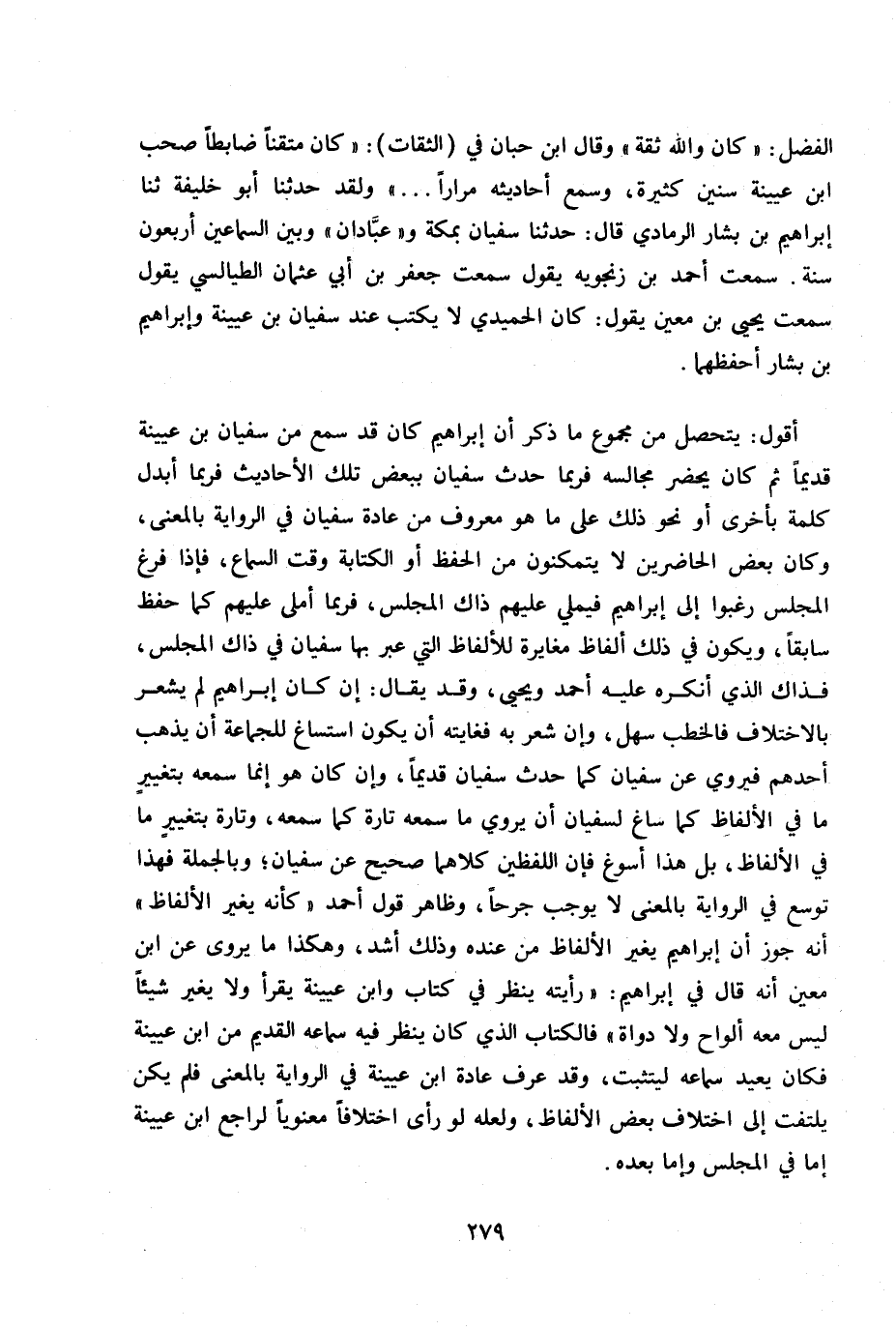 الفضل «كان والله ثقة» وقال ابن حبان في (الثقات) «كان متقناً ضابطاً صحب ابن عيينة سنين كثيرة، وسمع أحاديثه مراراً ... » ولقد حدثنا أبو خليفة ثنا إبراهيم بن بشار الرمادي قال: حدثنا سفيان بمكة و «عبَّادان» وبين السماعين أربعون سنة. سمعت أحمد بن زنجويه يقول سمعت جعفر بن أبي عثمان الطيالسي يقول: سمعت يحيى بن معين يقول: كان الحميدي لا يكتب عند سفيان بن عيينة وإبراهيم بن بشار أحفظهما. أقول يتحصل من مجموع ما ذكر أن إبراهيم كان قد سمع من سفيان بن عيينة قديماً ثم كان يحضر مجالسه فربما حد حدث سفيان ببعض تلك الأحاديث فربما أبدل كلمة بأخرى أو نحو ذلك على ما هو معروف من عادة سفيان في الرواية بالمعنى، وكان بعض الحاضرين لا يتمكنون من الحفظ أو الكتابة وقت السماع فإذا فرغ المجلس رغبوا إلى إبراهيم فيملي عليهم ذاك المجلس فربما أملي عليهم كما حفظ سابقا ويكون في ذلك ألفاظه مغايرة للألفاظ التي عبر عنها سفيان في ذاك المجلس، فذاك الذي أنكره عليه أحمد ويحيى، وقد يقال إن كان إبراهيم لم يشعر بالاختلاف فالخطب سهل وإن شعر به فغايته أن يكون استساغ للجماعة أن يذهب أحدهم فيروي عن سفيان كما حدث سفيان قديماً وإن كان هو إنما سمعه بتغيير ما في الألفاظ كما ساغ لسفيان أن يروي ما سمعه تارة كما سمعه، وتارة بتغيير ما في الألفاظ، بل هذا أسوغ فإن اللفظيين كلاهما صحيح عن سفيان. وبالجملة فهذا توسع في الرواية بالمعنى لا يوجب جرحا، وظاهر قول أحمد «كأنه يغير الألفاظ» أنه جوز أن إبراهيم يغير الألفاظ من عنده وذلك أشد، وهكذا ما يروي عن ابن معين قال في إبراهيم «رأيته ينظر في كتاب وابن عيينة يقرأ ولا يغير شيئاً ليس معه ألواح ولا دواة» فالكتاب الذي كان ينظر فيه سماعه القديم من ابن عيينة فكان يعيد سماعه ليتثبت وقد عرف عادة ابن عيينة في الرواية بالمعنى فلم يكن يلتفت إلى اختلاف بعض الألفاظ ولعله لو رأى اختلافا معنويا لراجع ابن عيينة إما في المجلس وإما بعده.