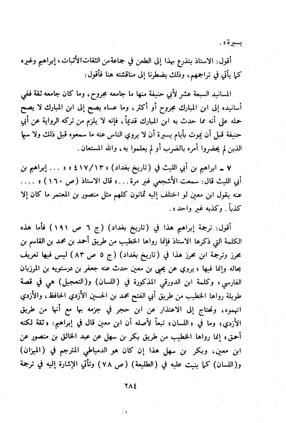 أقول: الأستاذ يتذرع بهذا إلى الطعن في جماعة من الثقات الأثبات، إبراهيم وغيره كما يأتي في تراجمهم وذلك يضطرنا إلى مناقشته هنا فأقول: