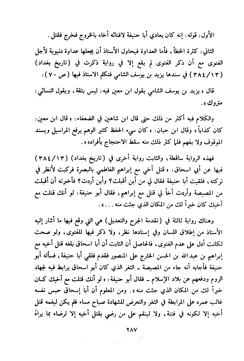 الأول: قوله أنه كان يعادي أبا حنيفة الأستاذ أن يجعلها عداوة دنيوية لأجل الفتوى مع أن ذكر الفتوى لم يقع إلا في رواية ذكرت في (تاريخ بغداد) (13 / 384) في سندها يزيد بن يوسف الشامي فتكلم الأستاذ فيها ص 70: