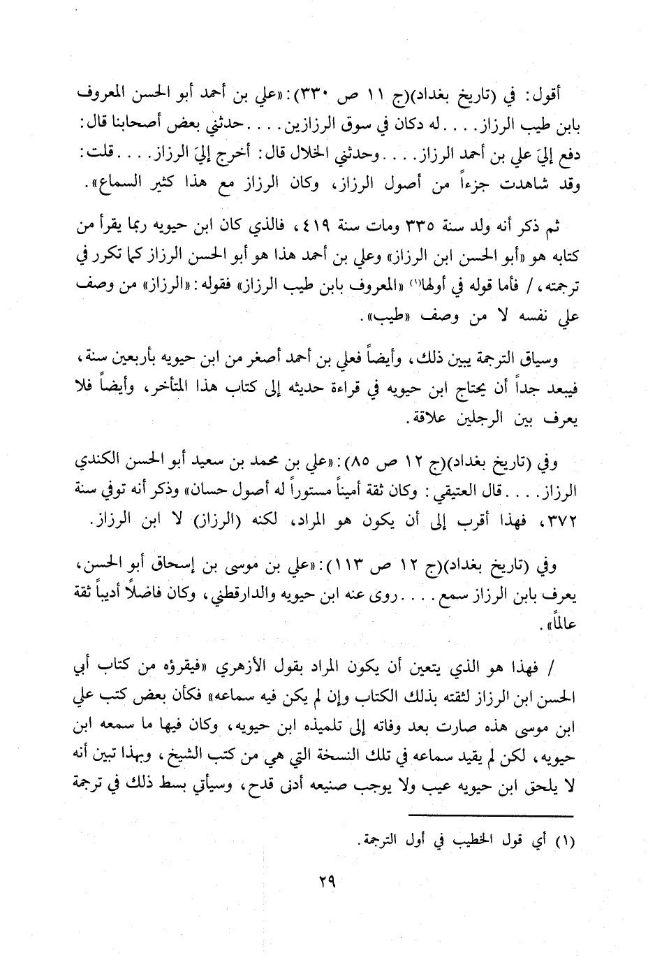 ثم ذكر أنه ولد سنة 335 ومات سنة 419، فالذي كان ابن حيويه ربما يقرأ من كتابه هو «أبو الحسن بن الرزاز» وعلي بن أحمد هذا هو أبو الحسن الرزاز كما تكرر في ترجمته، / فأما قوله في أولها (1) «المعروف بابن طيب الرزاز» فقوله: «الرزاز» من وصف علي نفسه لا من وصف «طيب» .