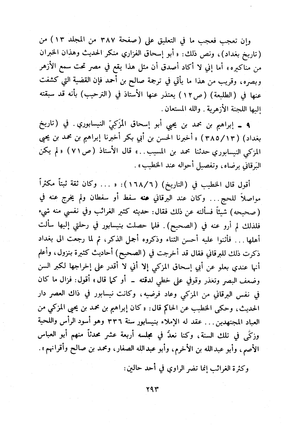 9- إبراهيم بن محمد بن يحيى أبو إسحاق المزكي النيسابوري. في (تاريخ بغداد) 13/ 385 «أخبرنا الحسن بن أبي بكر أخبرنا إبراهيم بن محمد بن يحيى المزكي النيسابوري حدثنا محمد بن المسيب..» قال الأستاذ ص 71 «لم يكن البرقاني يرضاه، وتفصيل أحواله عند الخطيب» .