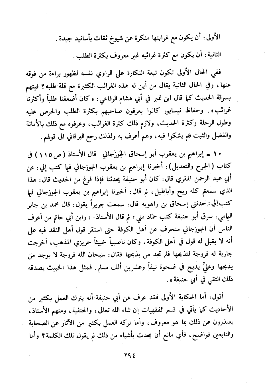 10- إبراهيم بن يعقوب أبو إسحاق الجوزجاني. قال الأستاذ ص 115 في كتاب (الجرح والتعديل) : «أخبرنا إبراهيم بن يعقوب الجوزجاني فيما كتب إلي: عن أبي عبد الرحمن المقري قال كان أبو حنيفة يحدثنا فإذا فرغ من الحديث قال هذا الذي سمعتم كله ريح وأباطيل، ثم قال: أخبرنا إبراهيم بن يعقوب الجوزجاني فيما كتب إليَّ حدثني إسحاق بن راهويه قال: سمعت جريراً يقول: قال محمد بن جابر اليمامي: سرق أبو حنيفة كتب حماد مني» ثم قال الأستاذ «وابن أبي حاتم من أعرف الناس أن الجوزجاني منحرف عن أهل الكوفة حتى استقر قول أهل النقد فيه على أنه لا يقبل له قول في أهل الكوفة، وكان ناصبياً خبيثاً حريزي المذهب أخرجت جارية له فروجة لتذبحها فلم تجد من يذبحها فقال: سبحان الله فروجة لا يوجد من يذبحها وعلي يذبح في ضحوة نيفا وعشرين ألف مسلم. فمثل هذا الخبيث يصدقه ذلك التقي في أبي حنيفة» .