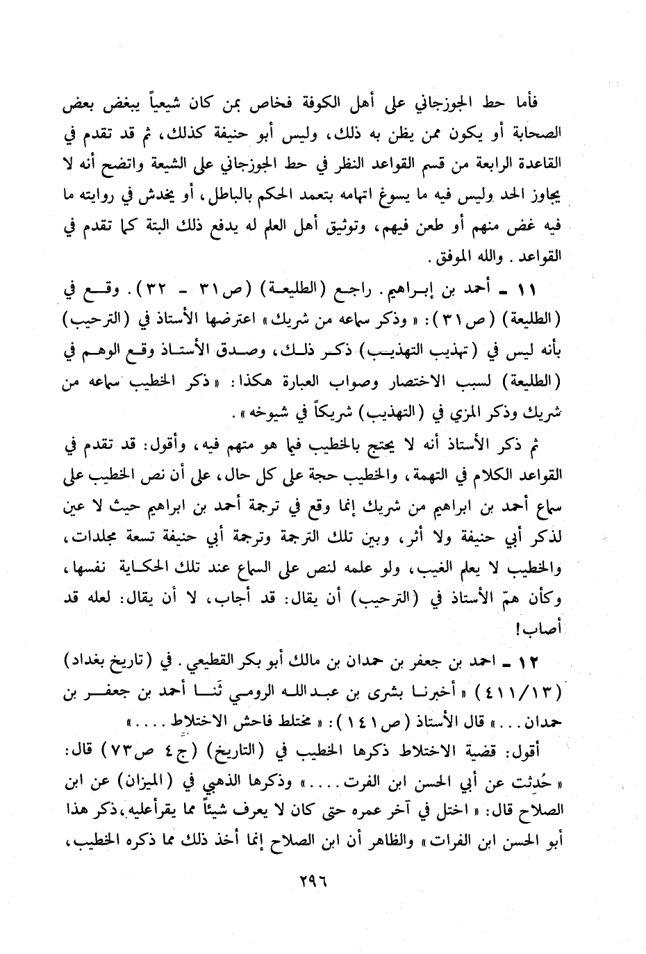 12- أحمد بن جعفر بن حمدان بن مالك أبو بكر القطيعي. في (تاريخ بغداد) (13 / 411) «أخبرنا بشرى بن عبد الله الرومي ثنا أحمد بن جعفر بن حمدان ... » قال الأستاذ ص 141: «مختلط فاحش الاختلاط ... .»