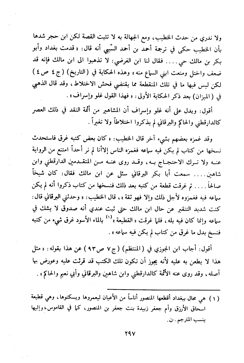 وقد غمزه بعضهم بشيء آخر قال الخطيب «كان بعض كتبه فاستحدث نسخها من كتاب لم يكن فيه سماعه فغمزه الناس إلا أنا لم نر أحداً امتنع من الرواية عنه ولا ترك الاحتجاج به، وقد روى عنه من المتقدمين الدارقطني وابن شاهين ... سمعت أبا بكر البرقاني سئل عن ابن مالك فقال كان شيخاً صالحاً ... ثم غرقت قطعة من كتبه بعد ذلك فنسخها من كتاب ذكروا أنه لم يكن سماعه فيه فغمزوه لأجل ذلك وإلا فهو ثقة» قال الخطيب «وحدثني البرقاني قال: كنت شديد التنقير عن حال ابن مالك حتى ثبت عندي أنه صدوق لا يشك في سماعه وإنما كان فيه بله، فلما غرقت «القطيعة» (1) بالماء الأسود غرق شيء من كتبه فنسخ بدل ما غرق من كتاب لم يكن فيه سماعه» .