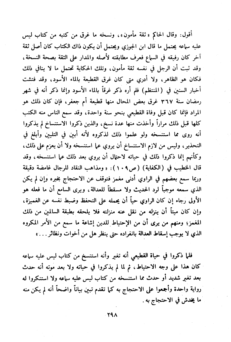 أقول: وقال الحاكم «ثقة مأمون» ونسخه ما غرق من كتبه من كتاب ليس عليه سماعه يحتمل ما قال ابن الجوزي ويحتمل أن يكون ذاك الكتاب كان أصل ثقة آخر كان رفيقه في السماع فعرف مطابقته لأصله والمدار على الثقة بصحة النسخة، وقد ثبت أن الرجل في نفسه ثقة مأمون، وتلك الحكاية تحتمل ما لا ينافي ذلك فكان هو الظاهر، ولا أدري متى غرق القطيعة بالماء والأسود، وقد فتشت أخبار السنين في (المنتظم) فلن أره ذكر غرقا بالماء السود وإنما ذكر أنه في شهر رمضان سنة 367 غرق بعض المحال منها قطيعة أم جعفر فإن كان ذلك هو المراد فإنما كان قبل وفاة القطيعي بنحو سنة واحدة وقد سمع الناس منه الكتب كلها قبل ذلك مراراً وأخذت منها عدة نسخ، والذين ذكروا الاستنساخ لم يذكروا أنه روى مما استنسخه ولو علموا ذلك لذكروه لأنه أبين في التليين وأبلغ في التحذير، وليس من لازم الاستنساخ أن يروي عما استنسخه ولا أن يعزم على ذلك، وكأنهم إنما ذكروا ذلك في حياته لاحتمال أن يروي بعد ذلك عما استنسخه، وقد قال الخطيب في (الكفاية) ص 109: «ومذاهب النقاد للرجال غامضة دقيقة وربما سمع بعضهم في الراوي أدنى مغمز فتوقف عن الاحتجاج بخبره وإن لم يكن الذي سمعه موجباً لرد الحديث ولا مسقطاً للعدالة، ويرى السامع أن ما فعله هو الأولى رجاء إن كان الراوي حياً أن يحمله على التحفظ وضبط نفسه عن الغميزة، وإن كان ميتاً أن ينزله من نقل عنه منزلته فلا يلحقه بطبقة السالمين من ذلك المغمز. ومنهم من يرى أن من الاحتياط للدين إشاعة ما سمع من الأمر المكروه الذي لا يوجب إسقاط العدالة بانفراده حتى ينظر هل من أخوات ونظائر ... » .