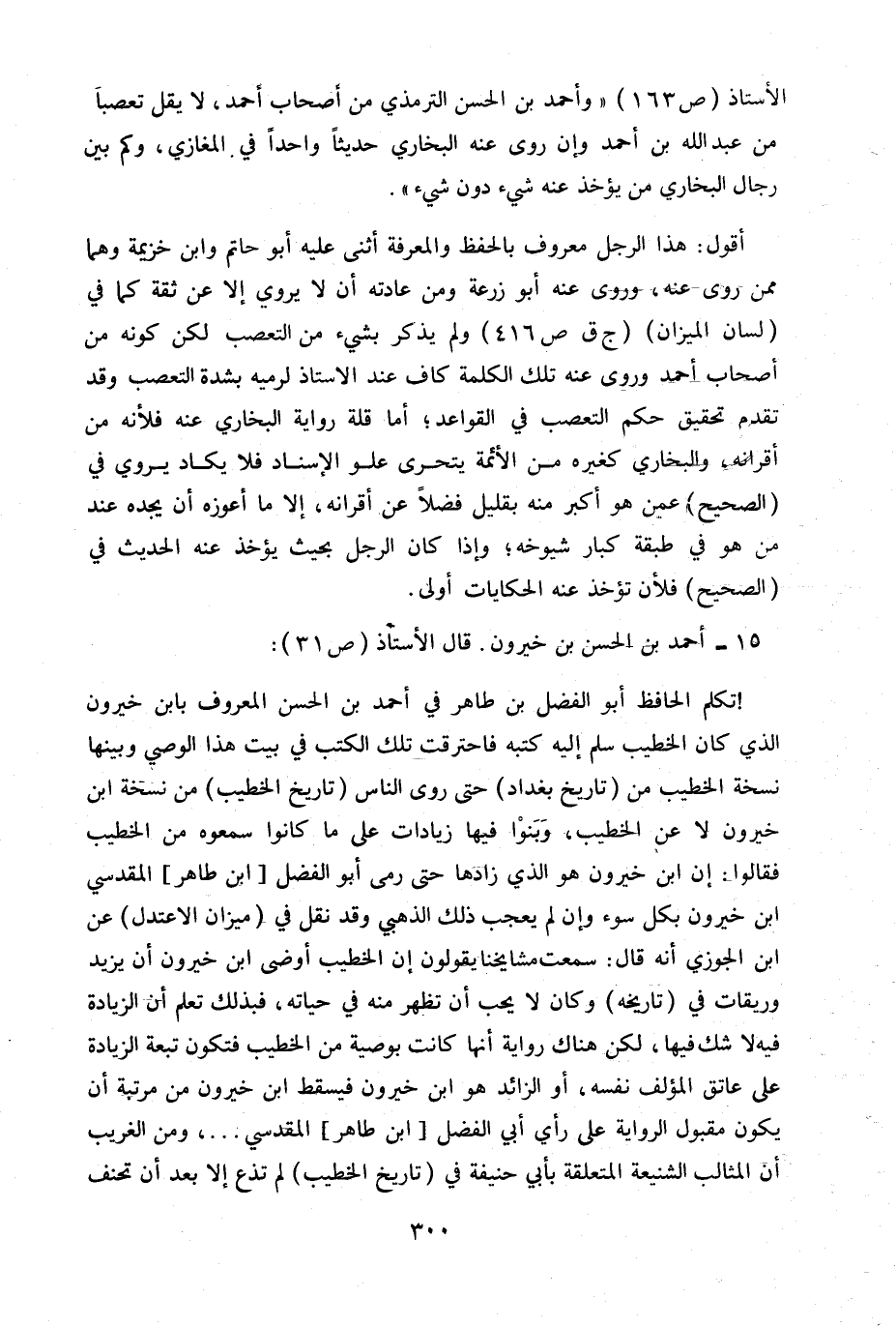 أقول هذا الرجل معروف بالحفظ والمعرفة أثنى عليه أبو حاتم وابن خزيمة وهما ممن روى عنه وروى عنه أبو زرعة ومن عادته أن لا يروي إلا عن ثقة كما في (لسان الميزان) ج2 ص 416 ولم يذكر بشيء من التعصب لكن كونه من أصحاب أحمد وروى عنه تلك الكلمة كاف عند الأستاذ لرميه بشدة التعصب وقد تقدم تحقيق حكم التعصب في