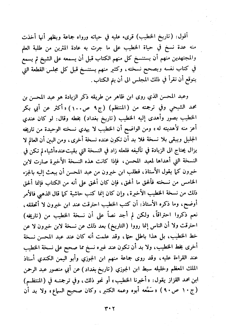 وعبد المحسن الذي روى ابن طاهر من طريقه ذكر الزيادة هو عبد المحسن بن محمد الشيحي وفي ترجمته من (المنتظم) ج9 ص100 «أكثر عن أبي بكر الخطيب بصور وأهدى إليه الخطيب (تاريخ بغداد) بخطه وقال: لو كان عندي أعز منه لأهديته له» ومن الواضح أن الخطيب لا يهدي نسخته الوحيدة من تاريخه الجليل ويبقى بلا نسخة فلا بد أن تكون عنده أخرى، ومن البين أن العالم لا يزال يحتاج إلى الزيادة في تأليفه فلعله زاد في النسخة التي بقيت عنده أشياء لم تكن في النسخة التي أهداها لعبد المحسن فإذا كانت هذه النسخة الأخيرة صارت لابن خيرون كما يقول الأستاذ فطلب ابن خيرون من عبد المحسن أن يبعث إليه بالجزء الخامس من نسخته فألحق ما ألحق فإن كان ألحق على أنه من الكتاب فإنما ألحق ذلك من نسخة الخطيب الأخيرة، وإن كان إنما كتب حاشية كما قال الذهبي فالأمر أوضح وما ذكره الأستاذ: أن كتب الخطيب احترقت عند ابن خيرون لا أتحققه، نعم ذكروا احتراقاً، ولكن لم أجد نصاً على أن نسخة الخطيب من (تاريخه) احترقت ولا أن الناس إنما رووا (التاريخ) بعد ذلك عن نسخة لابن خيرون لا عن خط الخطيب بل هذا باطل حتماً، وقد علمت أنه كان عند عبد المحسن نسخة أخرى بخط الخطيب، ولا بد أن تكون عند غيره نسخ مما صحح على نسخة الخطيب عند القراءة عليه وقد روى جماعة منهم ابن الجوزي وأبو اليمن الكندي أستاذ الملك المعظم وخليله سبط بن الجوزي (تاريخ بغداد) عن أبي منصور عبد الرحمن بن محمد القزاز يقول: «أخبرنا الخطيب» أو نحو ذلك، وفي ترجمته في من (المنتظم) ج 10 ص 90 «سَمَّعه أبوه وعمه الكثير، وكان صحيح السماع» ولا بد أن