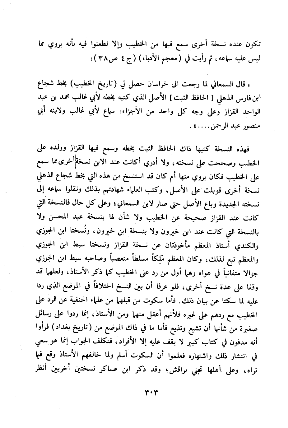 فهذه النسخة كتبها ذاك الحافظ الثبت بخطه وسمع فيها القزاز وولده على الخطيب وصححت على نسخته، ولا أدري أكانت عند الابن نسخة أخرى مما سمع على الخطيب فكان يروي منها أم كان قد استنسخ من هذه التي بخط شجاع الذهلي نسخة أخرى قوبلت على الأصل، وكتب العلماء شهادتهم بذلك ونقلوا سماعه إلى نسخته الجديدة وباع الأصل حتى صار لابن السمعاني. وعلى كل حال فالنسخة التي كانت عند القزاز صحيحة عن الخطيب ولا شأن لها بنسخة عبد المحسن ولا بالنسخة التي كانت عند ابن خيرون ولا بنسخة ابن خيرون، ونسختا ابن الجوزي والكندي أستاذ المعظم مأخوذتان عن نسخة القزاز ونسختا سبط ابن الجوزي والمعظم تبع لذلك وكان المعظم ملكاً مسلطاً متعصباً وصاحبه سبط ابن الجوزي جوالاً متفانياً في هواه وهما أول من رد على الخطيب كما ذكر الأستاذ ولعلهما قد وقفا على عدة نسخ أخرى فلو عرفا أن بين النسخ اختلافاً في الموضع الذي ردا عليه لما سكتا عن بيان ذلك.