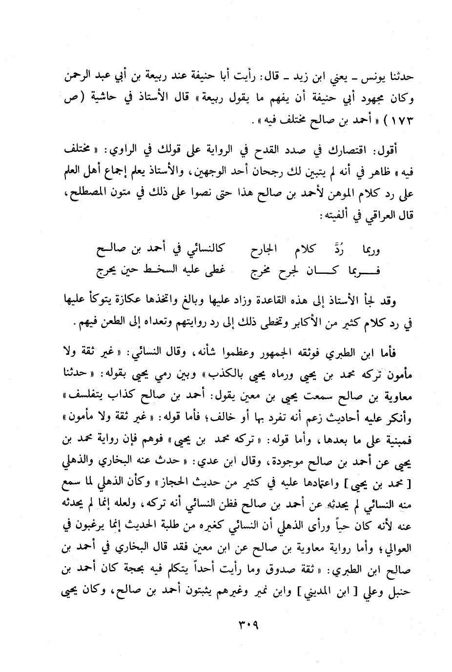 حدثنا يونس - يعني ابن زيد - قال رأيت أبا حنيفة عند ربيعة بن أبي عبد الرحمن وكان مجهود أبي حنيفة أن يفهم ما يقول ربيعة» . قال الأستاذ في حاشية ص173 «أحمد بن صالح مختلف فيه» .