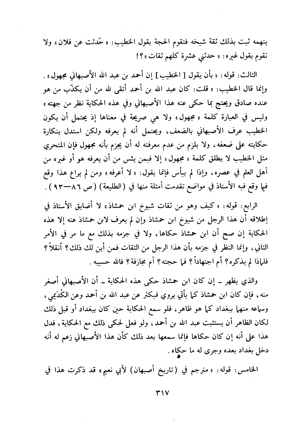 وإنما قال الخطيب: «قلت: كان عبد الله بن أحمد أتقى لله من أن يكذّب من هو عنده صادق ويحتج بما حكى عنه هذا الأصبهاني وفي هذه الحكاية نظر من جهته» وليس في العبارة كلمة «مجهول» ولا هي صريحة في معناها إذ يحتمل أن يكون الخطيب عرف الأصبهاني بالضعف ويحتمل انه لم يعرفه ولكن استدل بنكارة حكايته على ضعفه، ولا يلزم من عدم معرفته له أن يجزم بأنه مجهول فإن المتحري مثل الخطيب لا يطلق كلمة