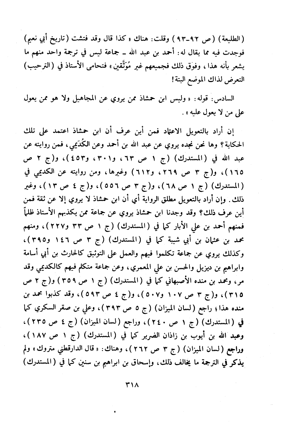 إن أراد بالتعويل الاعتماد فمن أين عرف أن ابن حمشاذ اعتمد على تلك الحكاية وها نحن نجده يروي عن عبد الله بن أحمد وعن الكديمي، فمن روايته عن عبد الله في (المستدرك) ج 1 ص 63 و301، و453، وج 2 ص 165، وج 3 ص 269، و612 وغيرها، ومن روايته عن الكديمي في (المستدرك) ج 1 ص 68، ج3 ص 556، وج 4 ص 13، وغير ذلك. وإن أراد بالتعويل مطلق الرواية أي أن ابن حمشاذ لا يروي إلا عن ثقة فمن أين عرف ذلك؟ وقد وجدنا ابن حمشاذ يروي عن جماعة ممن يكذبهم الأستاذ ظلماً فمنهم أحمد بن علي الأبار كما في (المستدرك) ج 1 ص33 و227، ومنهم محمد بن عثمان بن أبي شيبة كما في (المستدرك) ج 3 ص 146 و395، وكذلك يروي عن جماعة تكلموا فيهم والعمل على التوثيق كالحارث بن أبي أسامة وإبراهيم بن ديزيل والحسن بن علي المعمري، وعن جماعة متكلم فيهم كالكديمي وقد مرَّ، ومحمد بن منده الأصبهاني كما في (المستدرك) ج1 ص359 وج2 ص315، وج3 ص107 و507، وج4 ص593، وقد كذبوا محمد بن منده هذا راجع (لسان الميزان) ج 5 ص 393، وعلي بن صقر السكري كما في (المستدرك) ج 1 ص 240، وراجع (لسان الميزان) ج 4 ص 235، وعبد الله بن أيوب بن زاذان الضرير كما في (المستدرك) ج 1 ص 187، وراجع (لسان الميزان) ج 3 ص 262، وهناك: (قال الدارقطني متروك» ولم يذكر في الترجمة ما يخالف ذلك، وإسحاق بن إبراهيم بن سنين كما في (المستدرك)