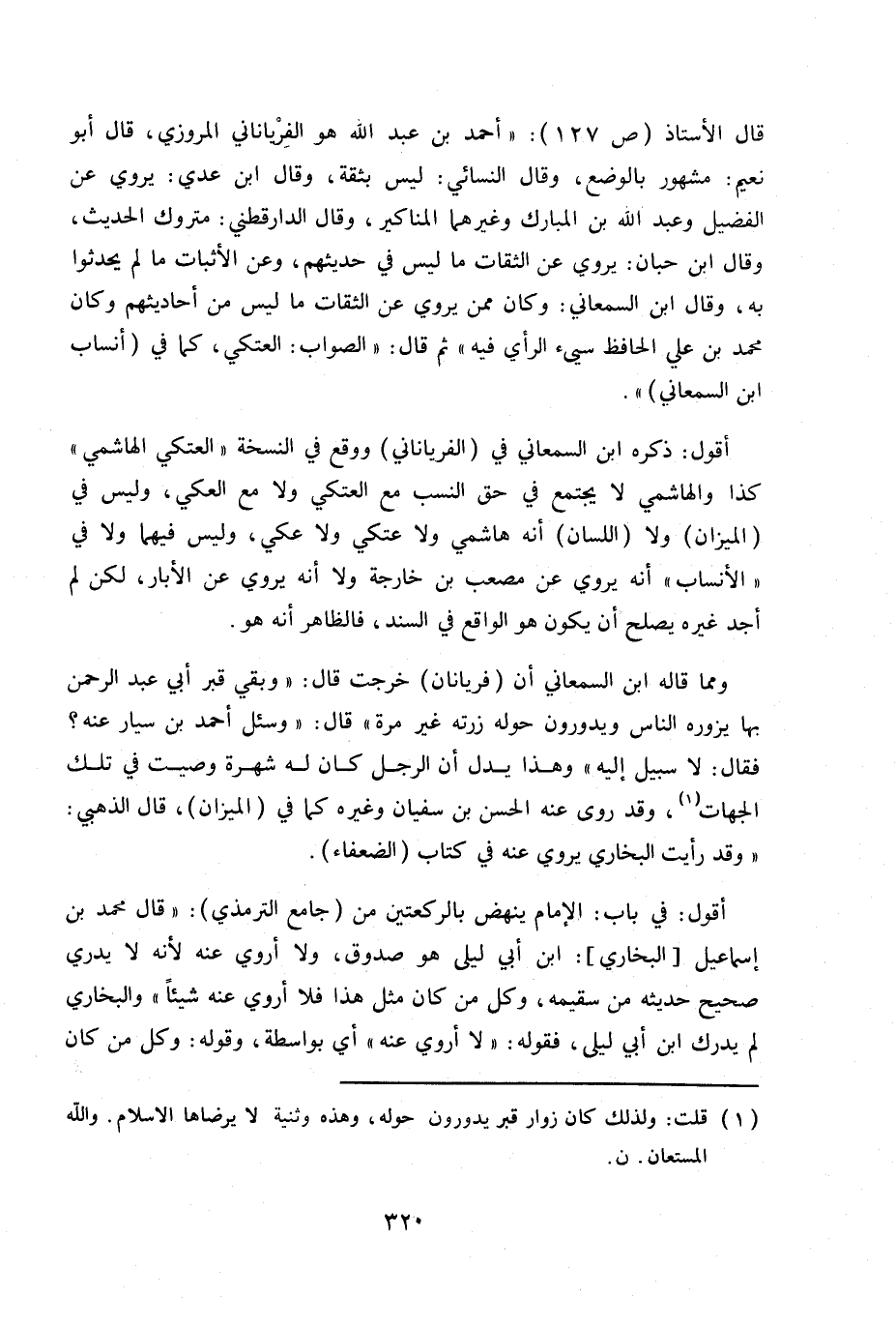 أقول ذكره ابن السمعاني في (الفرياناني) ووقع في النسخة «العتكي الهاشمي» كذا والهاشمي لا يجتمع في حق النسب مع العتكي ولا مع العكي، وليس في (الميزان) ولا (اللسان) أنه هاشمي ولا عتكي ولا عكي، وليس فيهما ولا في «الأنساب» أنه يروي عن مصعب بن خارجه ولا أنه يروي عن الأبار، لكن لم أجد غيره يصلح أن يكون هو الواقع في السند، فالظاهر أنه هو. ومما قاله ابن السمعاني أن (فريانان) خربت قال: «وبقي قبر أبي عبد الرحمن بها يزوره الناس ويدورون حوله زرته غير مرة» قال «وسئل أحمد بن سيار عنه؟ فقال: لا سبيل إليه» .