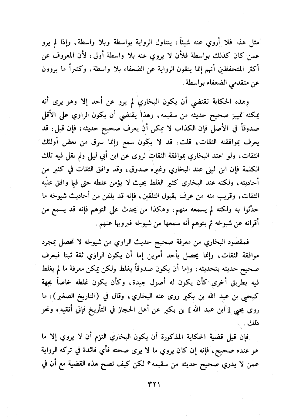 مثل هذا فلا أروي عنه شيئاً» يتناول الرواية بواسطة وبلا واسطة، وإذا لم يرو عمن كان كذلك بواسطة فلأن لا يروي عنه بلا واسطة أولى، لأن المعروف عن أكثر المتحفظين أنهم إنما يتقون الرواية عن الضعفاء بلا واسطة، وكثيراً ما يروون عن متقدمي الضعفاء بواسطة. وهذه الحكاية تقتضي أن يكون البخاري لم يروعن أحد إلا وهو يرى أنه يمكنه تمييز صحيح حديثه من سقيمه وهذا يقتضي أن يكون الراوي على الأقل صدوقاً في الأصل فإن الكذاب لا يمكن أن يعرف صحيح حديثه. فإن قيل قد يعرف بموافقته الثقات لروى عن ابن أبي ليلى ولم يقل فيه تلك الكلمة فإن ابن ليلى عند البخاري وغيره صدوق وقد وافق عليه الثقات في كثير من أحاديثه ولكنه عند البخاري كثير الغلط بحيث لا يؤمن غلطه حتى فبما وافق عليه الثقات، وقريب منه من عرف بقبول التلقين فأنه قد يلقن من أحاديث شيوخه ما حد ثوابه ولكنه لم يسمعه منهم، وهكذا من يحدث على التوهم فأنه قد يسمع من أقرأنه عن شيوخه ثم يتوهم أنه سمعها من شيوخه فيرويها عنهم.
