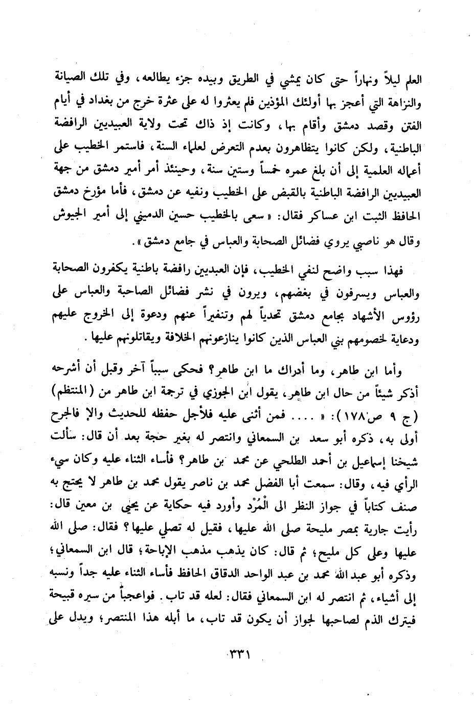 وأما ابن طاهر وما أدراك ما ابن طاهر؟ فحكى سبباً آخر وقبل أن اشرحه أذكر شيئاً من حال ابن طاهر، يقول ابن الجوزي في ترجمة ابن طاهر من (المنتظم) ج 9 ص 178 « ... . فمن أثنى عليه فلأجل حفظه للحديث وإلا فالجرح أولى به، ذكره أبو سعد بن السمعاني وانتصر له بغير حجة بعد أن قال سألت شيخنا إسماعيل بن أحمد الطلحي عن محمد بن طاهر؟ فأساء الثناء عليه وكان سيئ الرأي فيه، وقال سمعت أبا الفضل محمد بن ناصر يقول محمد بن طاهر لا يحتج به صنف كتاباً في جواز النظر إلى المرد وأورد فيه حكاية عن يحيى بن معين قال رأيت جارية بمصر مليحة صلى الله عليها، فقيل له تصلي عليها؟ فقال صلى الله عليها وعلى كل مليح - ثم قال: كان يذهب مذهب الإباحة. قال ابن السمعاني. وذكره أبو عبد الله محمد بن الواحد الدقاق الحافظ فأساء الثناء عليه جداً ونسبة إلى أشياء. ثم انتصر له ابن السمعاني فقال: لعله قد تاب. فوا عجباً ممن سيره قبيحة فيترك الذم لصاحبها لجواز أن يكون قد تاب، ما أبله هذا المنتصر. ويدل على