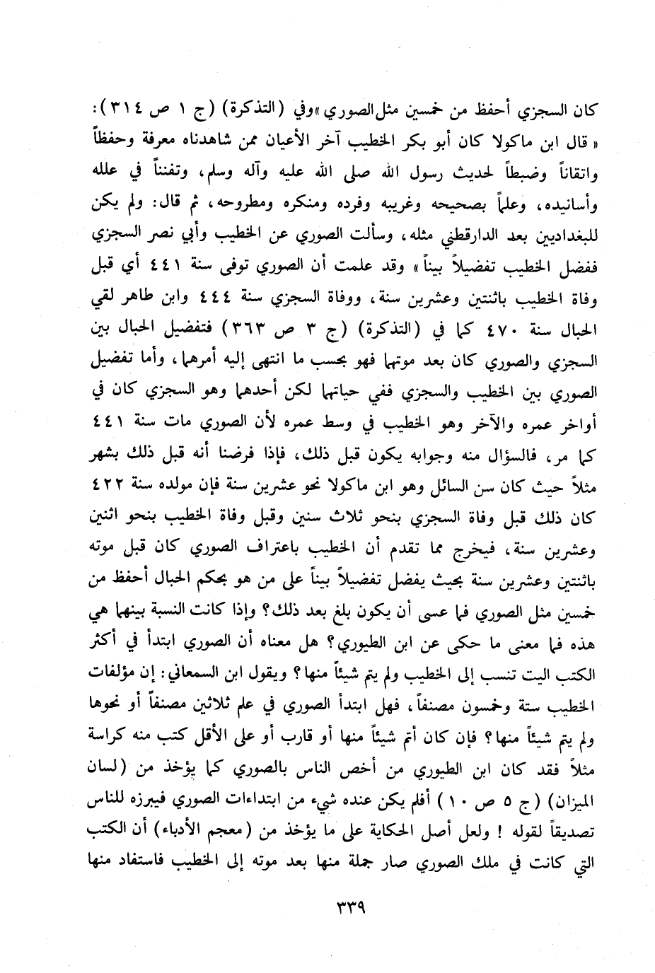 كان السجزي أحفظ من خمسين مثل الصوري» وفي (التذكرة) ج 1 ص 314: «قال ابن ماكولا كان أبو بكر الخطيب آخر الأعيان ممن شاهدناه معرفة وحفظاً واتقاناً وضبطاً لحديث رسول الله صلى الله عليه وآله وسلم وتفنناً في علله وأسانيده وعلماً بصحيحه وغريبه وفرده ومنكره ومطروحه، ثم قال: ولَم يكن للبغداديين بعد الدارقطني مثله، وسألت الصوري عن الخطيب وأبي نصر السجزي ففضل الخطيب تفضيلاً بيناً» وقد علمت أن الصوري توفي سنة 441 أي قبل وفاة الخطيب باثنتين وعشرين سنة، ووفاة السجزي سنة 444 وابن طاهر لقي الحبال سنة 470 كما في (التذكرة) ج 3 ص 363 فتفضيل الحبال بين السجزي والصوري كان بعد موتهما فهو بحسب ما انتهى إليه أمرهما ن وأما تفضيل الصوري بين الخطيب والسجزي ففي حياتهما لكن أحدهما وهو السجزي كان في أواخر عمره والآخر وهو الخطيب في وسط عمره لأن الصوري مات سنة 441 كما مر فالسؤال منه وجوابه يكون قبل ذلك فإذا فرضنا أنه قبل ذلك بشهر مثلاً حيث كان سن السائل وهو ابن ماكولا نحو عشرين سنة فإن مولده سنة 422 كان قبل وفاة السجزي بنحو ثلاث سنين وقبل وفاة الخطيب بنحو اثنين وعشرين سنة، فيخرج مما تقدم أن الخطيب باعتراف الصوري كان قبل موته باثنتين وعشرين سنة بحيث يفضل تفضيلاً بيناً على من هو بحكم الحبال أحفظ من خمسين مثل الصوري فما عسى أن يكون بلغ بعد ذلك؟ وإذا كانت النسبة بينهما هي هذه فما معنى ما حكى عن ابن الطيوري؟ هل معناه أن الصوري ابتدأ في أكثر الكتب التي تنسب إلى الخطيب ولم يتم شيئاً منها؟ يقول ابن السمعاني أن مؤلفات الخطيب ستة وخمسون مصنفاً فهل ابتدأ الصوري في عمل ثلاثين مصنفاً أو نحوها ولم يتم شيئا منها؟ فإن كان أتم شيئاً شيئاً منها أو قارب أو على الأقل كتب منه كراسة مثلاً فقد كان ابن الطيوري من أخص الناس بالصوري كما يؤخذ من (لسان الميزان) ج5 ص10 أفلم يكن عنده شيء من ابتداءات الصوري فيبرز للناس تصديقاً لقوله؟ ولعل أصل الحكاية على ما يؤخذ من (معجم الأدباء) أن الكتب التي كانت ملك الصوري صار جملة منها بعد موته إلى الخطيب فاستفاد منها
