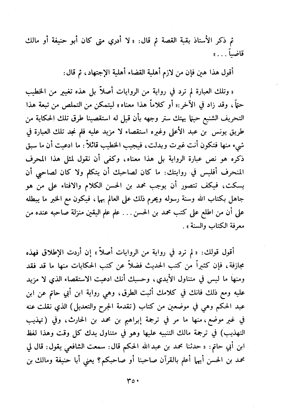 «وتلك العبارة لم ترد في رواية من الروايات أصلاً بل هذه تغير من الخطيب حتماً وقد زاد في الآخر «أو كلاماً هذا معناه» ليتمكن من التملص من تبعة هذا التحريف الشنيع حينما يهتك ستر وجهه بأن قيل له استقصينا طرق تلك الحكاية من طريق يونس ابن عبد الأعلى وغيره استقصاء لا مزيد عليه فلم نجد تلك العبارة في شيء منها فتكون أنت غيرت وبدلت، فيجيب الخطيب قائلاً: ما ادعيت أن ما سبق ذكره هو نص عبارة الرواية بل هذا معناه، وكفى أن نقول لمثل هذا المحرف المنحرف أفليس في روايتك: ما كان لصاحبك أن يتكلم ولا كان لصاحبي أن يسكت، فكيف تتصور أن يوجب محمد ابن الحسن الكلام والإفتاء على من هو جاهل بكتاب الله وسنة رسوله ويحرم ذلك على العالم بهما، فيكون مع الخبر ما يبطله على أن من اطلع على كتب محمد بن الحسن ... عَلِمَ عِلْمَ اليقين منزلة صاحبه عنده من معرفة الكتاب والسنة.