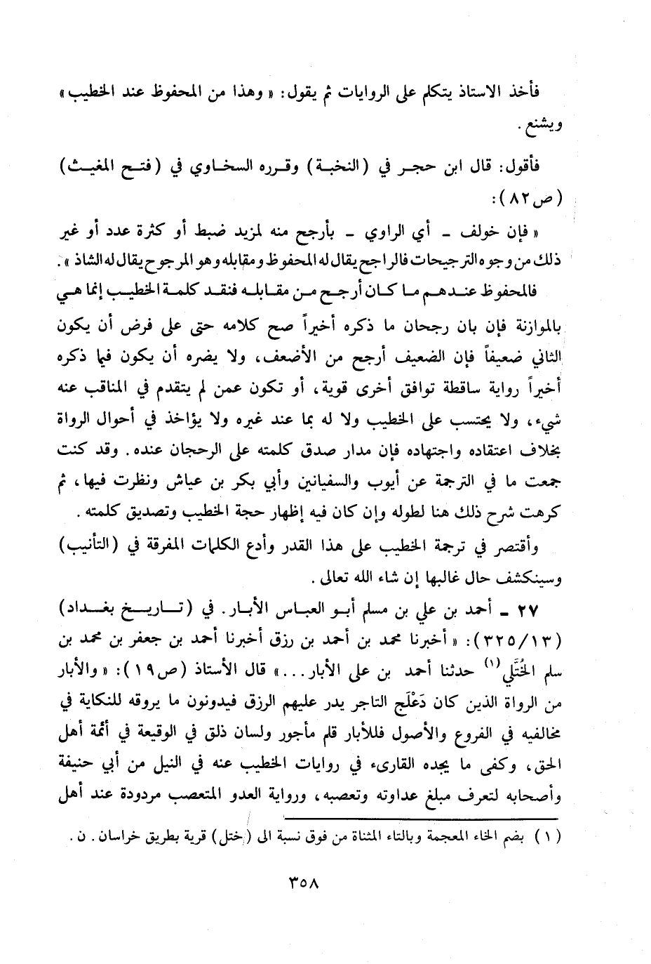 فالمحفوظ عندهم ما كان أرجح من مقابله فنقد كلمة الخطيب إنما هي بالموازنة فإن بان رجحان ما ذكره أخيراً صحَّ كلامه حتى على فرض أن يكون الثاني ضعيفاً فإن الضعيف أرجح من الأضعف، ولا يضره أن يكون فيما ذكره أخيراً رواية ساقطة توافق أخرى قوية، أو تكون عمن لم يتقدم في المناقب عنه شيء، ولا يحتسب على الخطيب ولا له بما عند غيره ولا يؤاخذ في أحوال الرواة بخلاف اعتقاده واجتهاده فإن مدار صدق كلمته على الرجحان عنده. وقد كنت جمعت ما في الترجمة عن أيوب والسفيانين وأبي بكر بن عياش ونظرت فيها، ثم كرهت شرح ذلك هنا لطوله وإن كان فيها إظهار حجة الخطيب وتصديق كلمته.