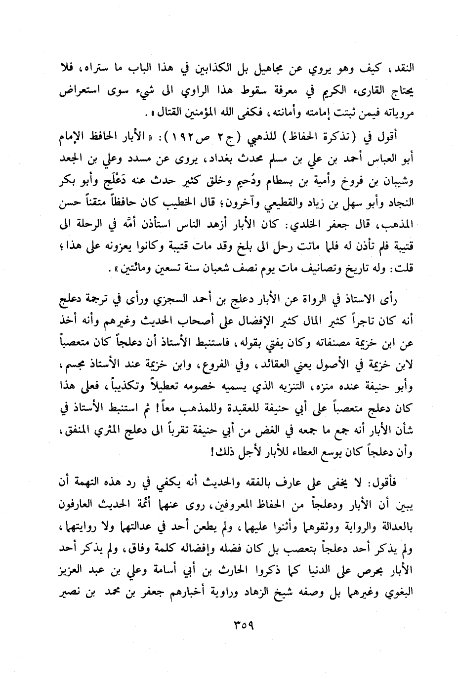 فأقول: لا يخفى على عارف بالفقه والحديث أنه يكفي في رد هذه التهمة أن يبين أن الأبار ودعلجاً من الحفاظ المعروفين روى عنهما أئمة الحديث العارفون بالعدالة والرواية ووثقوهما وأثنوا عليهما، ولم يطعن أحد في عدالتهما ولا روايتهما، ولم يذكر أحد دعلجاً بتعصب بل كان فضله وأفضاله كلمة وفاق، ولم يذكر أحد الأبار يحرص على الدنيا كما ذكروا الحارث بن أبي أسامة وعلي بن عبد العزيز البغوي وغيرهما بل وصفه شيخ الزهاد ورواية أخبارهم جعفر بن محمد بن نصير