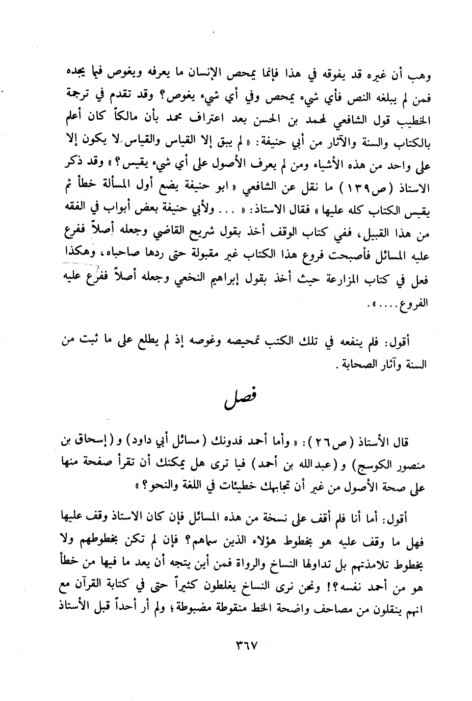 وهب أن غيره قد يفوقه في هذا فإنما يمحص الإنسان ما يعرفه ويغوص فيما يجده فمن لم يبلغه النص فأي شيء يمحص وفي أي شيء يغوص؟ وقد تقدم في ترجمة الخطيب قول الشافعي لمحمد ابن الحسن بعد اعتراف محمد بأن مالكاً كان أعلم بالكتاب والسنة والآثار من أبي حنيفة: «لم يبق إلا القياس والقياس لا يكون إلا على واحد من هذه الأشياء ومن لم يعرف الأصول على أي شيء يقيس؟» وقد ذكر الأستاذ ص139 ما نقل عن الشافعي «أبو حنيفة يضع أول المسألة خطأ ثم يقيس الكتاب كله عليها» نقل الأستاذ: « ... ولأبي حنيفة بعض أبواب الفقه من هذا القبيل، ففي كتاب الوقف أخذ بقول شريح القاضي وجعله أصلاً ففرع عليه المسائل فأصبحت فروع هذا الكتاب غير مقبولة حتى ردها صاحباه، وهكذا فعل في كتاب المزارعة حيث خذ بقول إبراهيم النخعي وجعله أصلاً ففرع عليه الفروع ... » .
